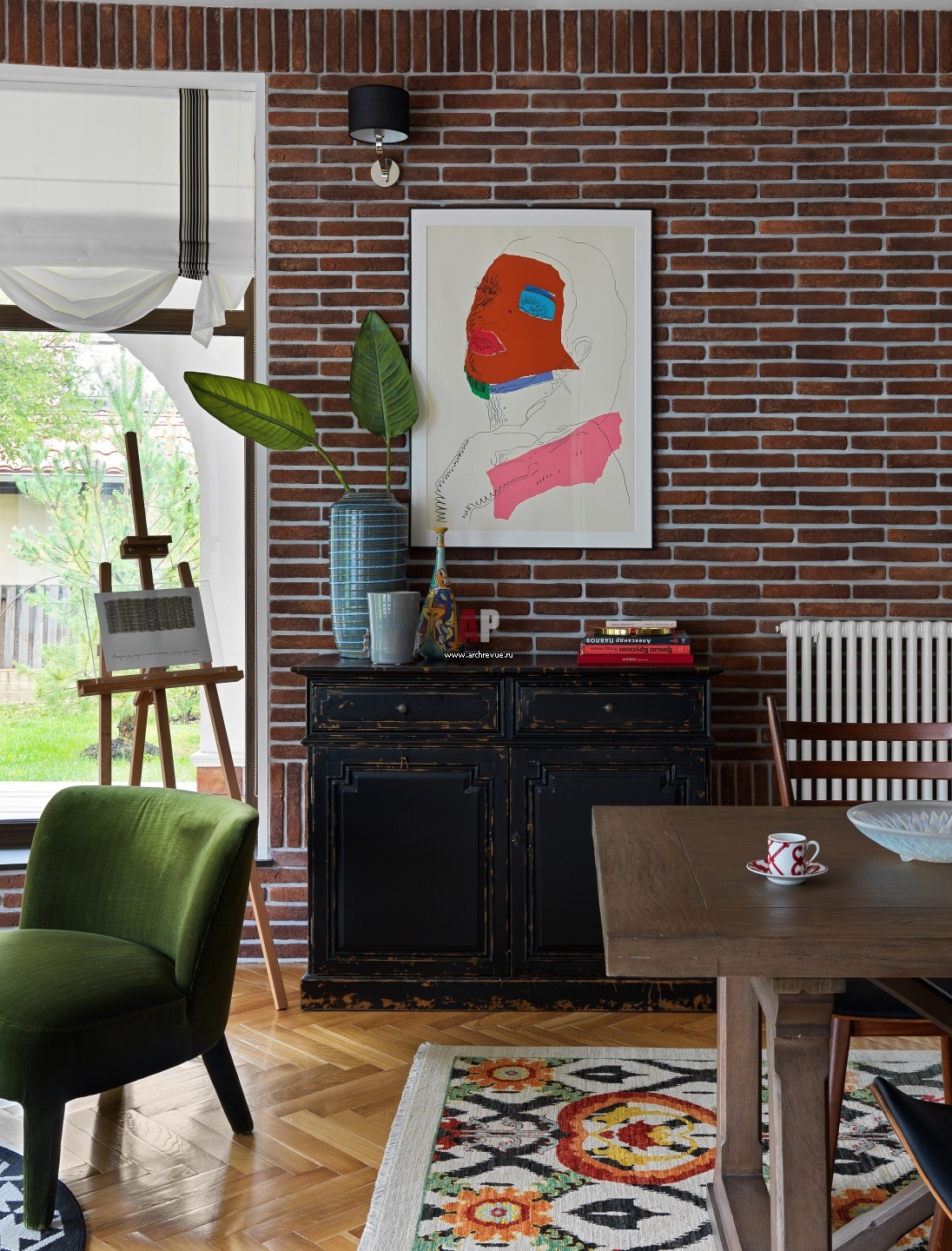 Стены общей зоны первого этажа облицованы клинкерным кирпичом темного коричневого цвета. На полу – дубовый паркет-елочка. Карнизы с лаконичным орнаментом из лепного гипса.