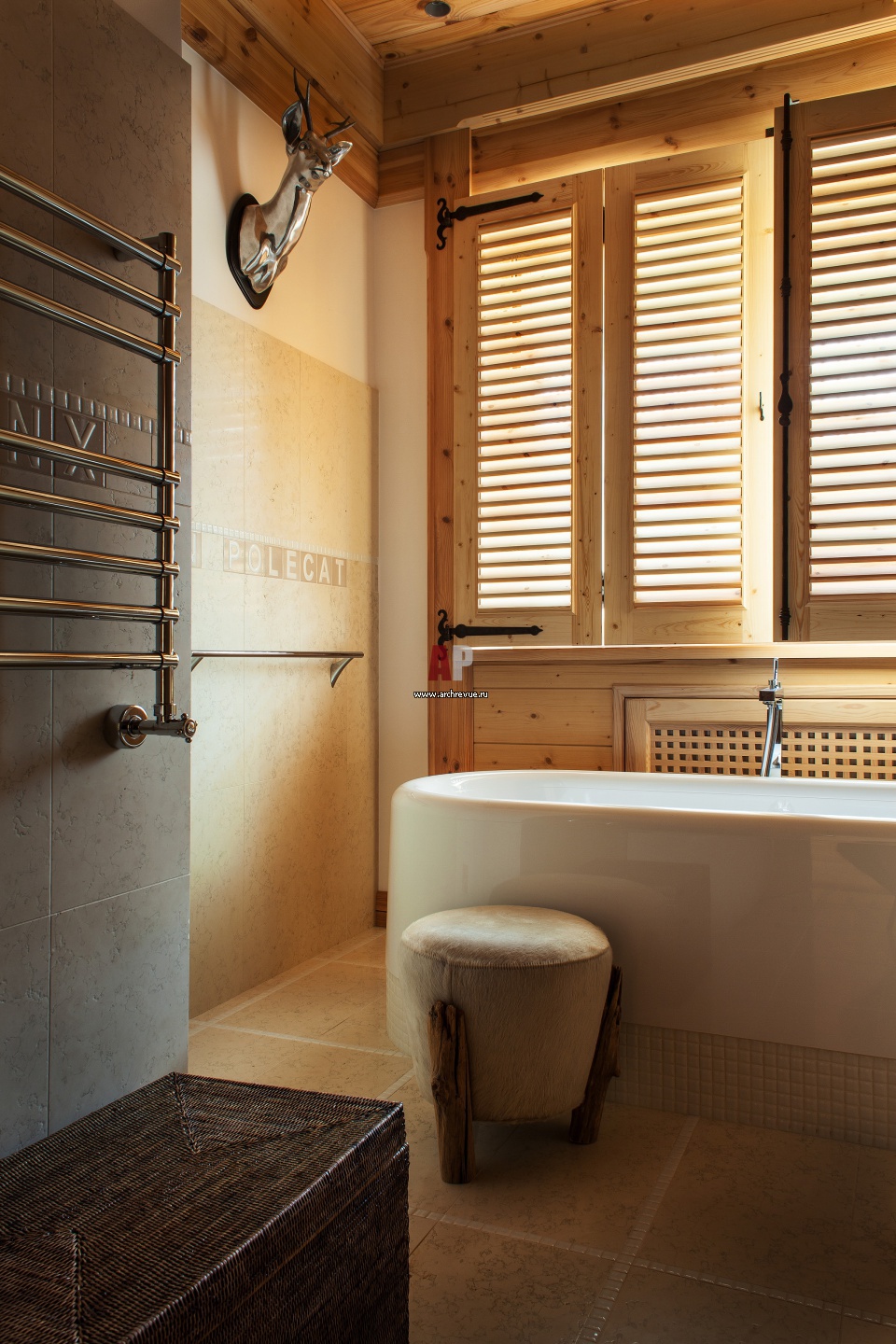 Интерьер ванной комнаты с отдельно стоящей ванной, Villeroy & Boch. Низкий пуф от Bleu Nature, ножки из топляка, сиденье обтянуто мехом пони.