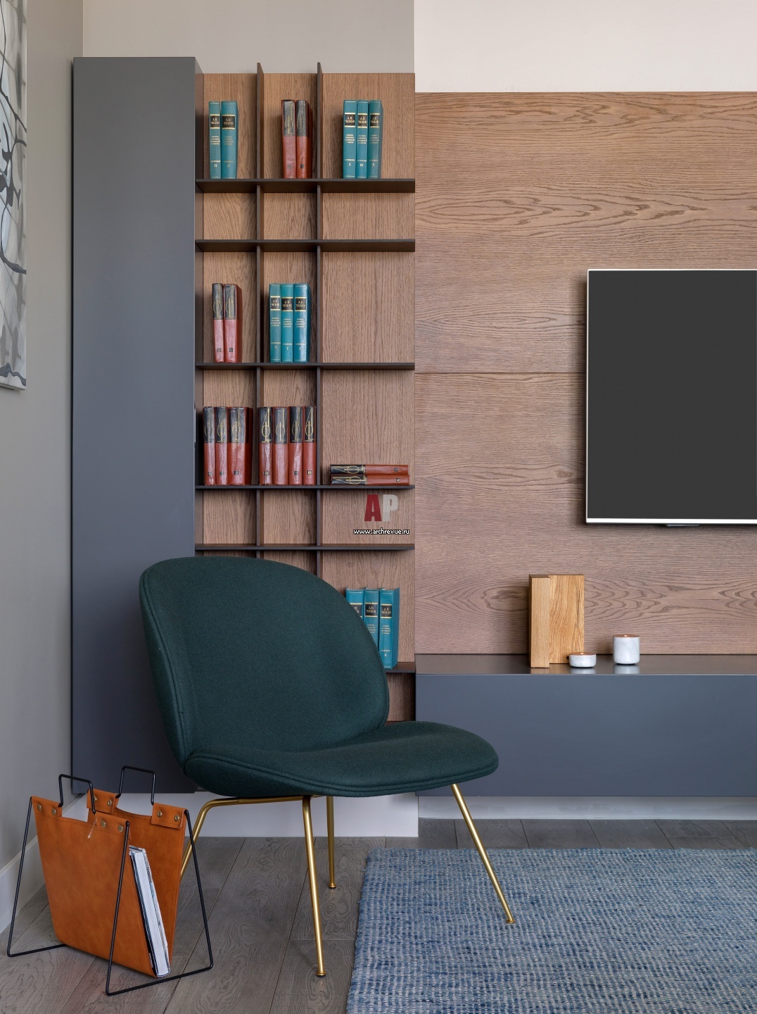 Медиа-зона в гостиной. Стеллаж, тумба под ТВ, Olivieri. Кресло, Gubi.