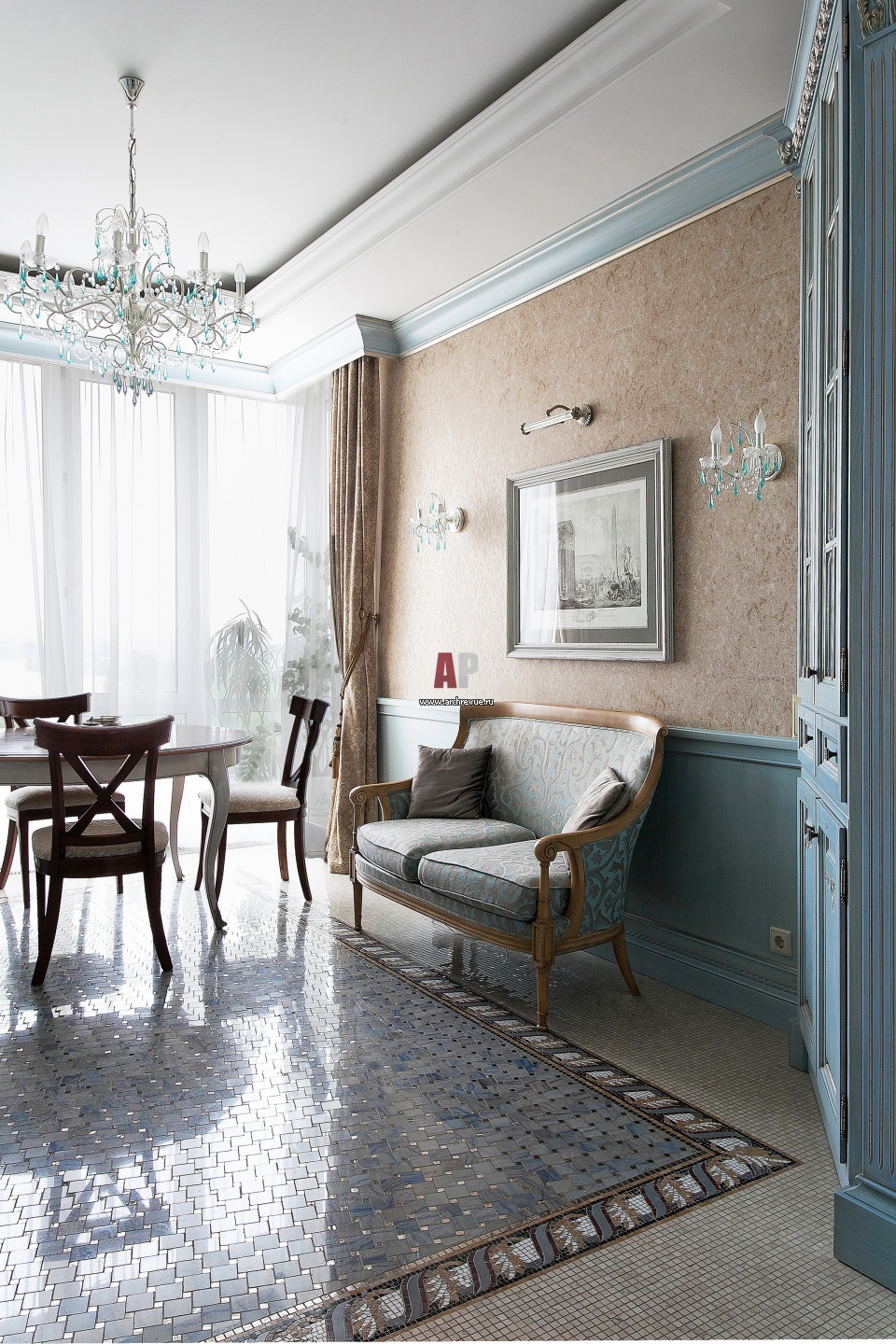 На полу кухни – панно из мраморной мозаики Sicis серебристо-голубого цвета со вставками смальты цвета белого золота. Оно перекликается с искрящейся водной гладью за окном.