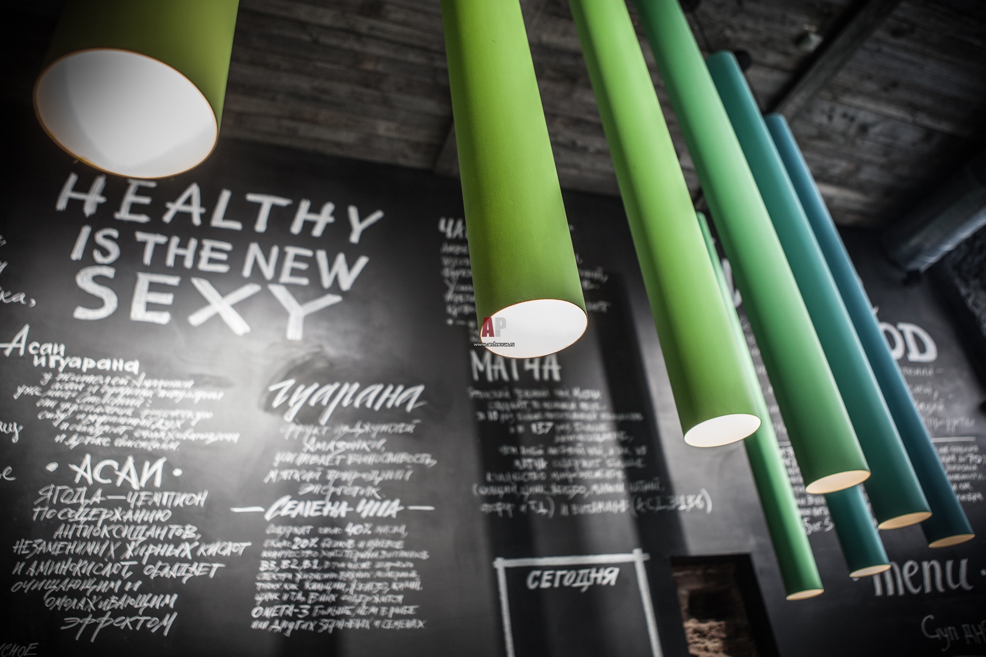Фото дизайна бара вегетарианского кафе, где готовятся свежевыжатые соки и травяные чаи.