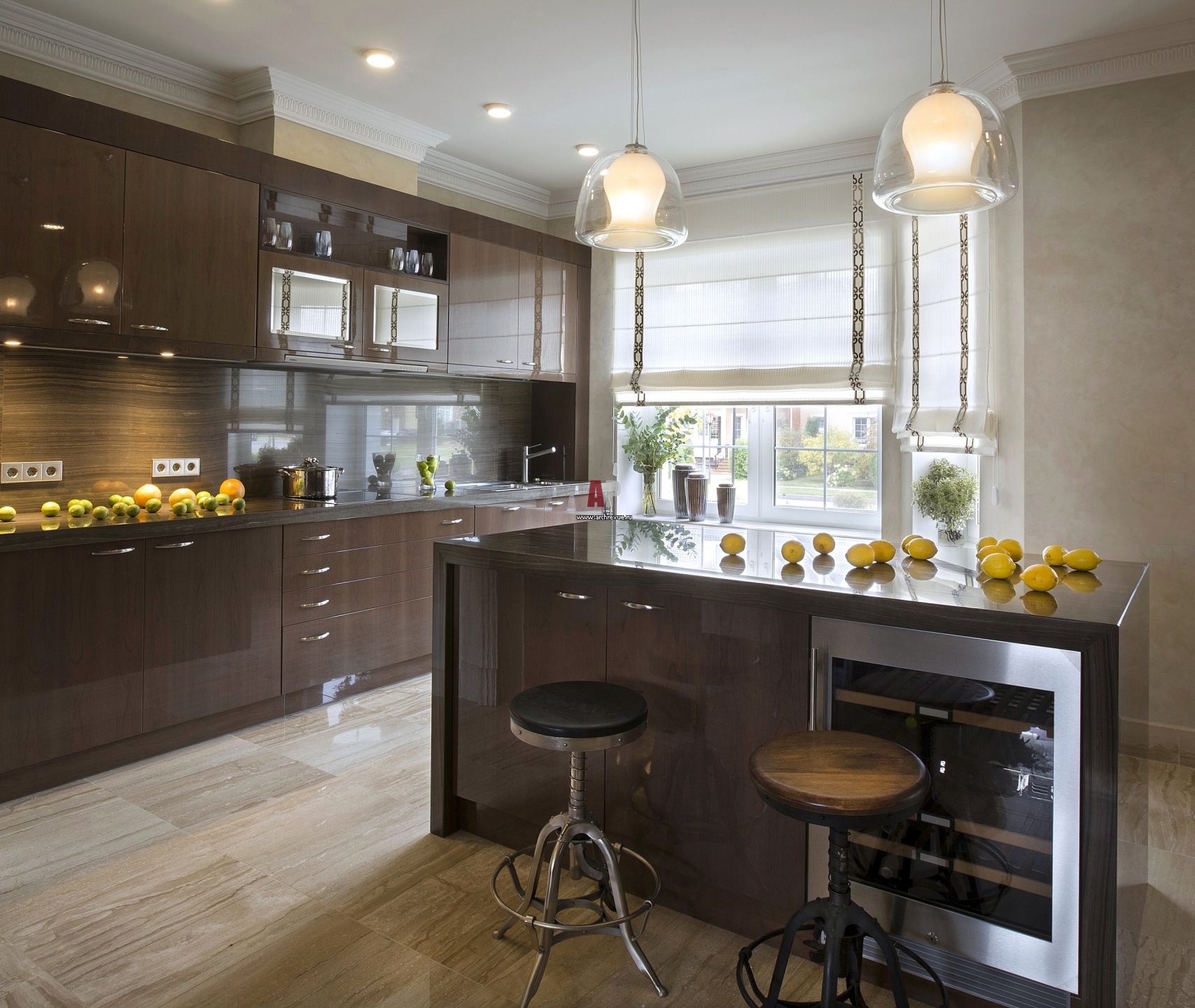 Кухня выполнена в современном стиле с элементами ар-деко. Кухонный гарнитур с деревянными глянцевыми фасадами, Neff Kitchens.