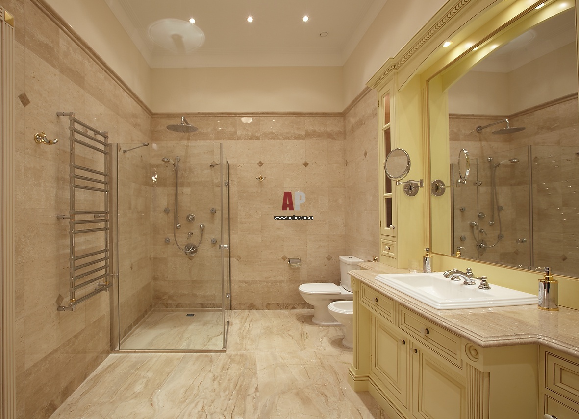 Основной санузел выложен мрамором: стены облицованы плиткой, а полы – слэбами, поставщик A-Stone. Из мрамора сделан и поддон душевой кабины: он идеально примыкает к стеклянной конструкции душа благодаря фрезеровке на месте.