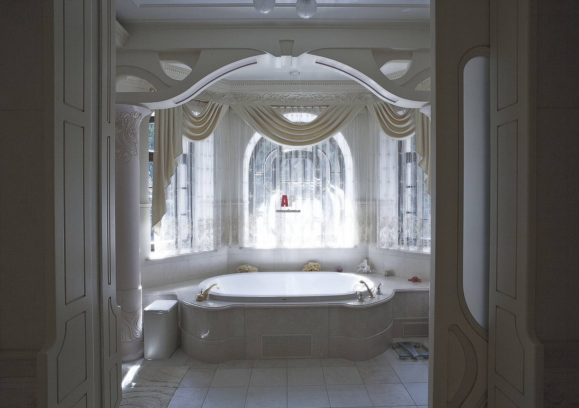 Интерьер беломраморной ванной комнаты. Его украшают колонны и лепной гипсовый карниз.