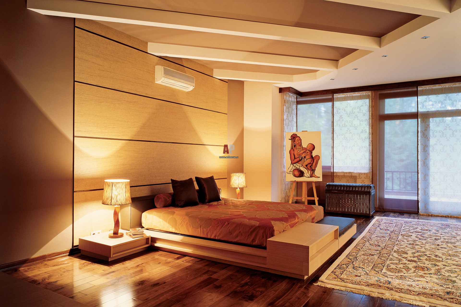 Этнический дизайн в оформлении спальни. Кровать, ящики для белья, прикроватные тумбочки, потолочные фальш-балки и декоративные панели сделаны из светлого дерева.