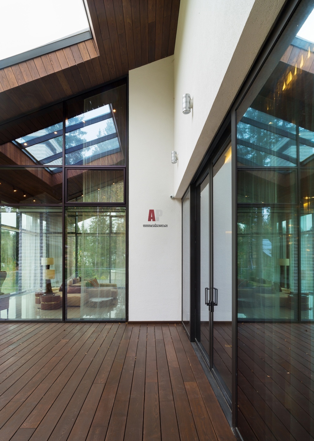 Архитектурная особенность здания – просторные террасы с деревянным настилом и открытые балконы, которые обеспечивают связь интерьера с природой и создают оптимальные условия для отдыха за городом.