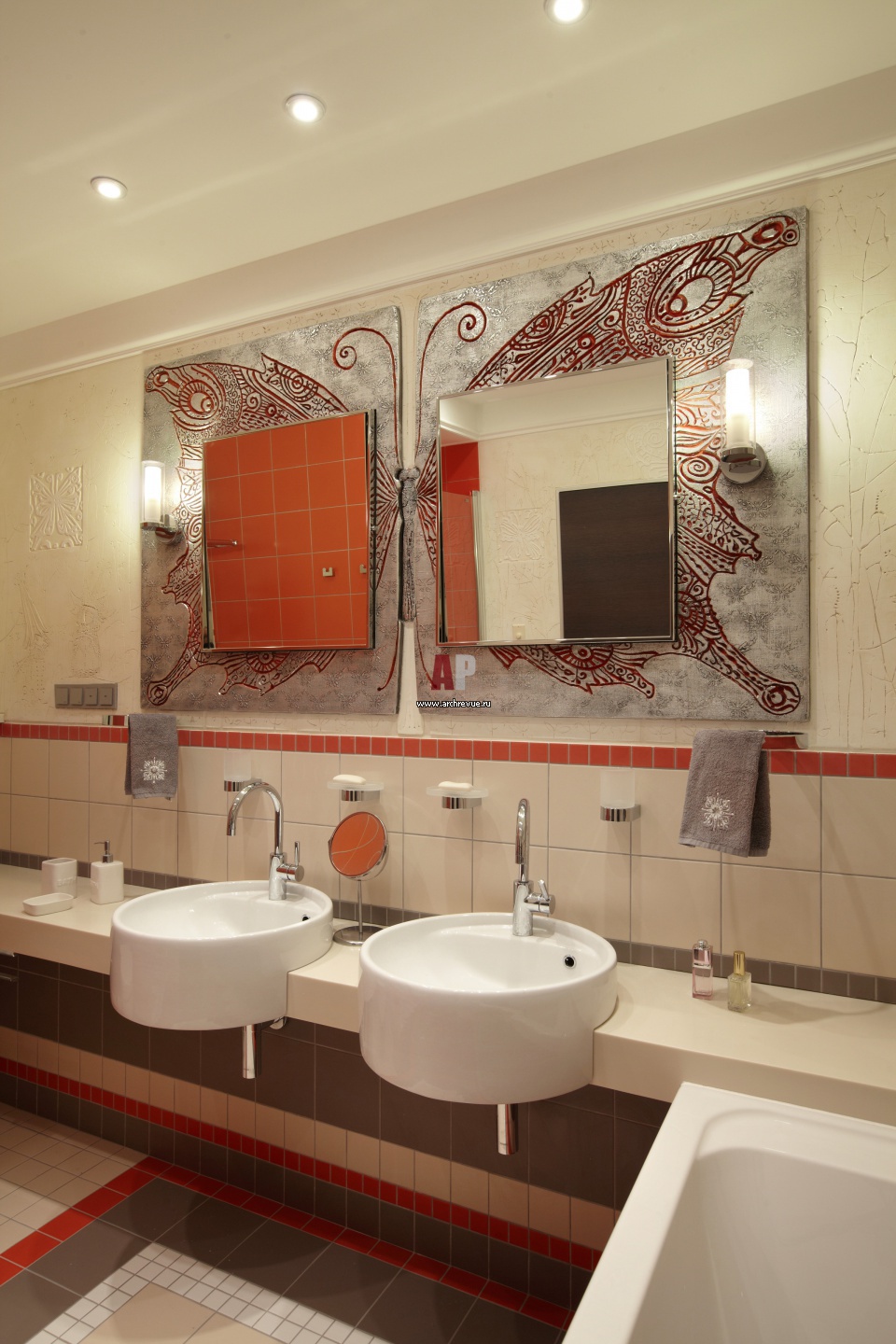 Интерьер ванной комнаты с авторской росписью. Два зеркала над умывальником оформлены как панно. Они объединены рельефной росписью с изображением бабочки с раскрытыми крыльями. Раковины, Flaminia. Роспись стен, художник Александр Резвяков.