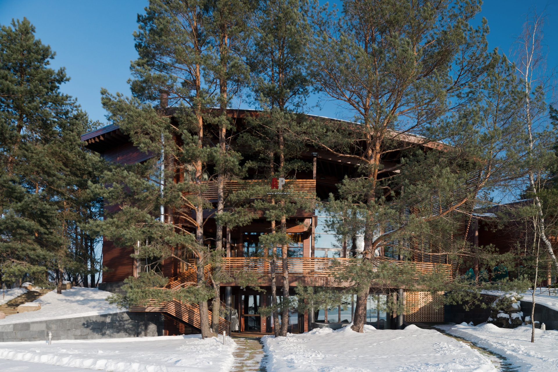 Дом находится на участке с перепадом по высоте. Главный фасад двухэтажного дома обращен на воду и имеет плавно изогнутую форму с открытыми террасами и лестницами.