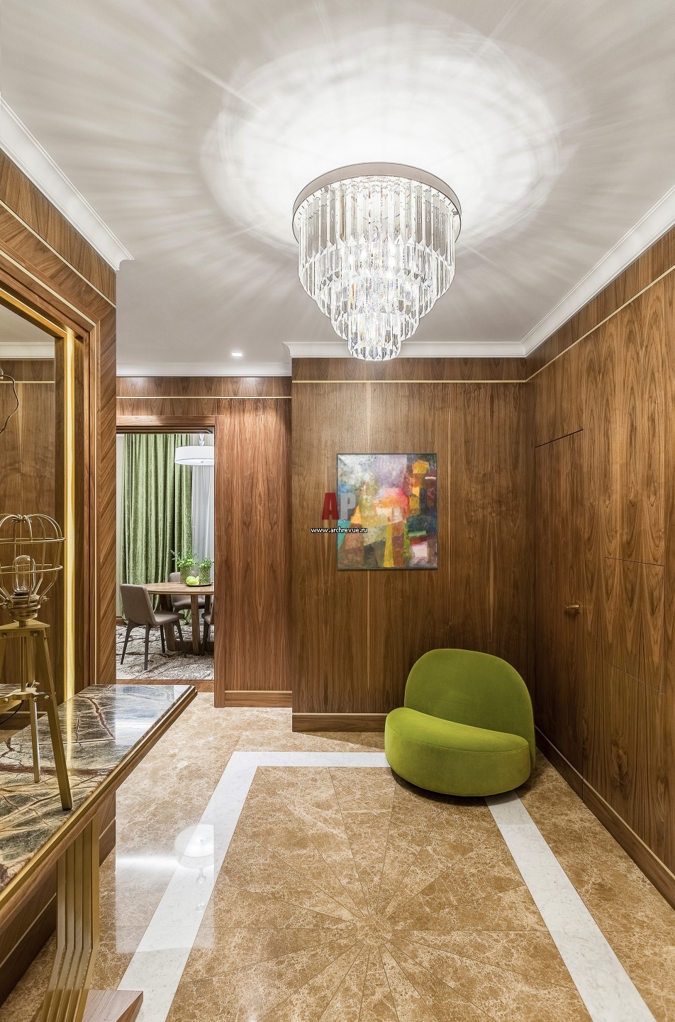 Холл выполнен в парадном ключе. Стены оформлены панелями из американского ореха, на полу – мраморное панно с укладкой в виде солнечных лучей. Кресло, Ligne Roset. Хрустальная люстра, Newport, модель Jamestown. Картина «Дом–дорога» Константина Евменева.
