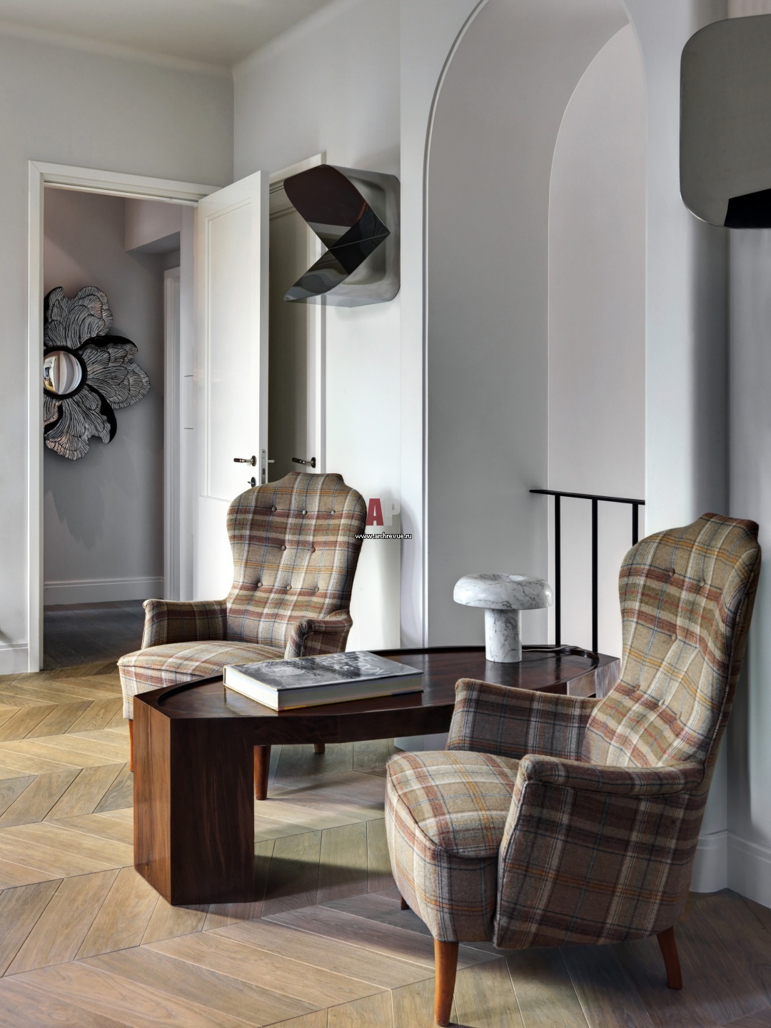 Зона отдыха в холле. Кресла, винтаж, по дизайну Карла Малмстена, Швеция, 1940-е годы. Зеркало, из коллекции заказчиков.