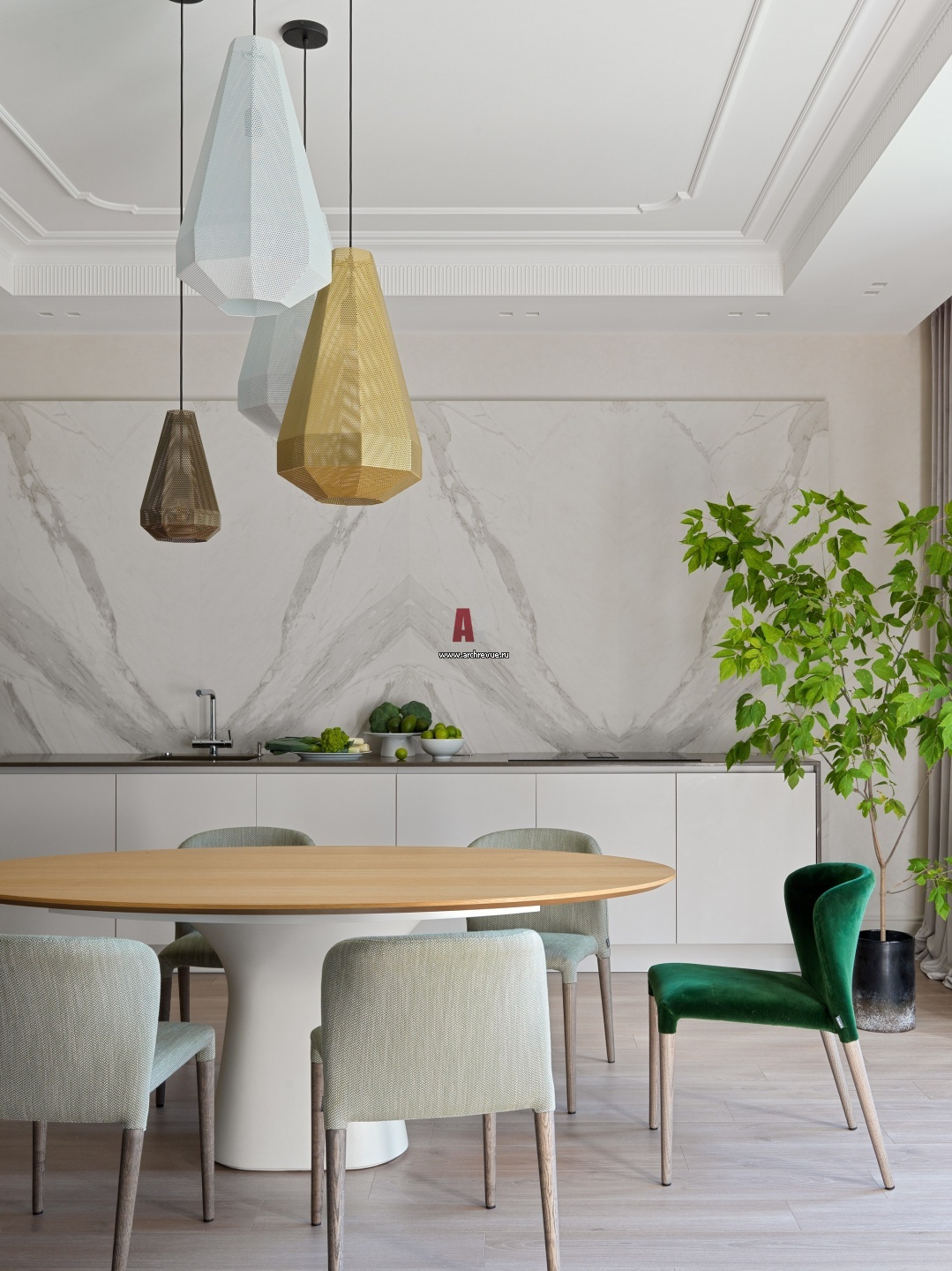 Зона столовой. Обеденный стол, Bontempi, модель Podium. Стулья, Alf DaFre, модель Karol. Светильники, Bontempi, модель Pandora.