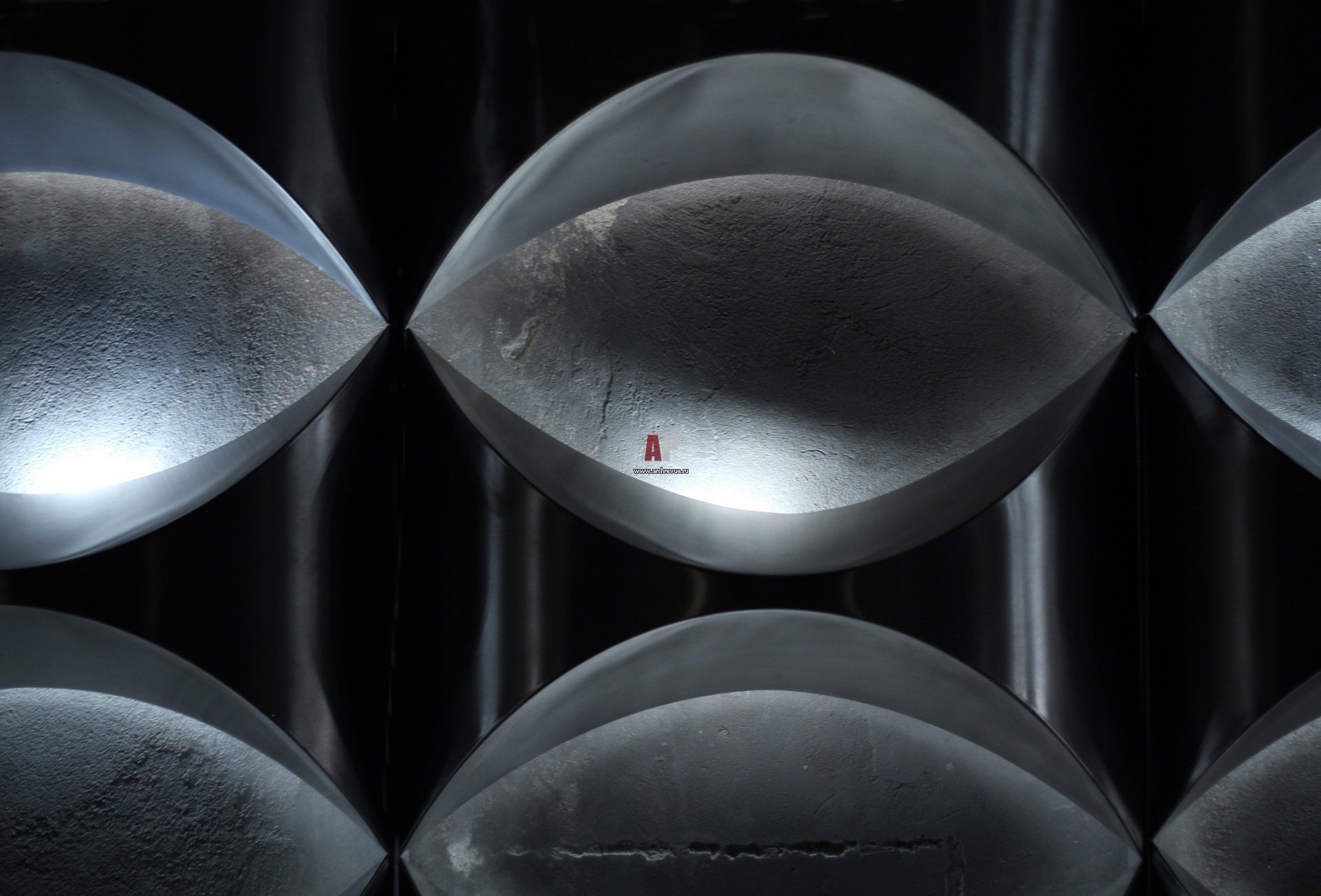 Металлический светильник с прорезями-лепестками укреплен на бетонной стене. Лампы вмонтированы за конструкцией из металла, благодаря чему скульптурные лепестки четко освещены.