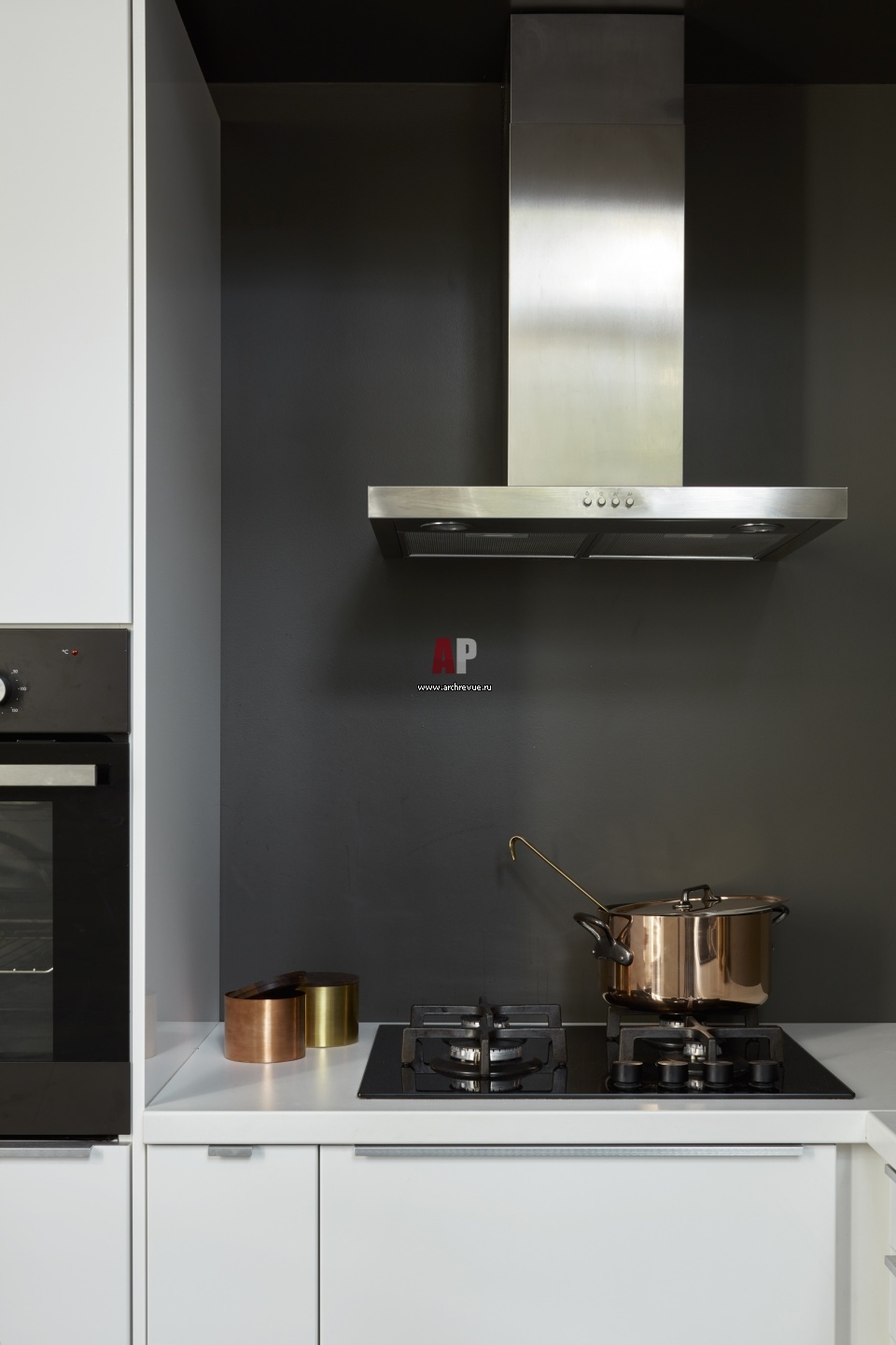 Интерьер кухни. Фартука как такового нет, стена в зоне готовки и сервировки выкрашена темно-серой краской. Медная посуда, Mauviel.