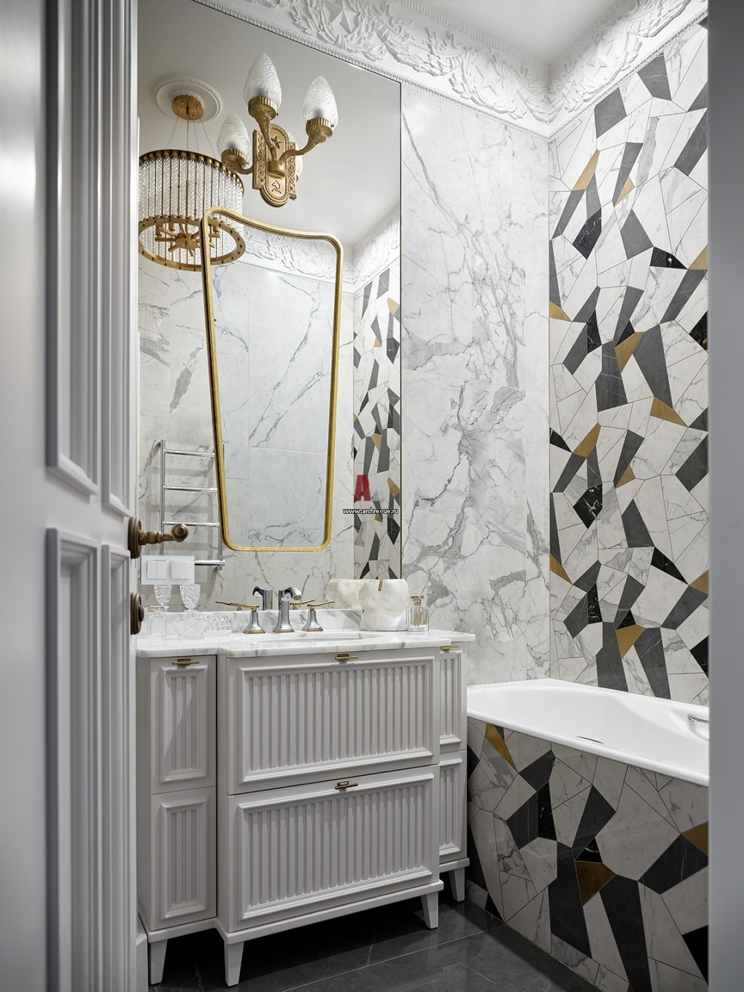 Главное украшение санузла – гипсовый барельеф с советскими звездами. Тумба под раковину сделана на заказ, по эскизам дизайнера. Бра на зеркале, 1930-е годы.