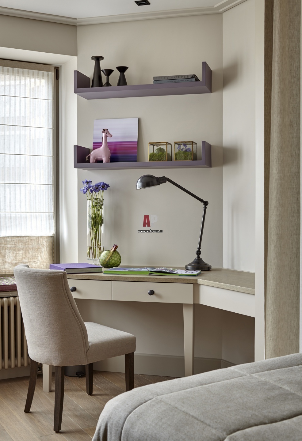 Комната девочки. Угловая рабочая зона размещена в эркере. Рабочий стол завершается стеллажом, подоконник используется в качестве сиденья. Рабочий стол, стеллаж и полки выполнены под заказ Стул, Charrell. Аксессуары, Crate and Barrel.