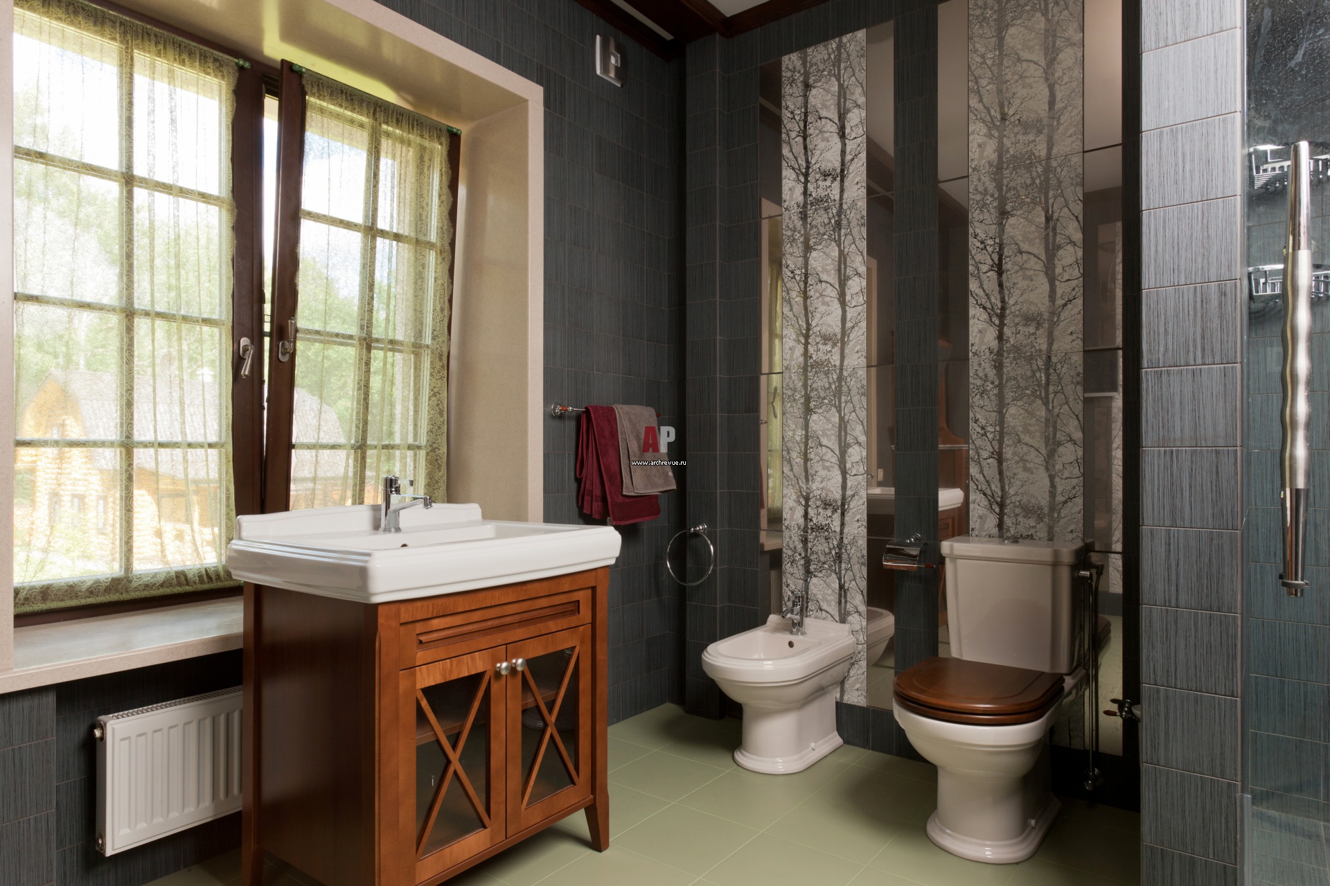 Мужской санузел с эко-темой. В оформлении использована плитка CottoVeneto, зеркальные вставки из коллекции фабрики Venis Ceramica.