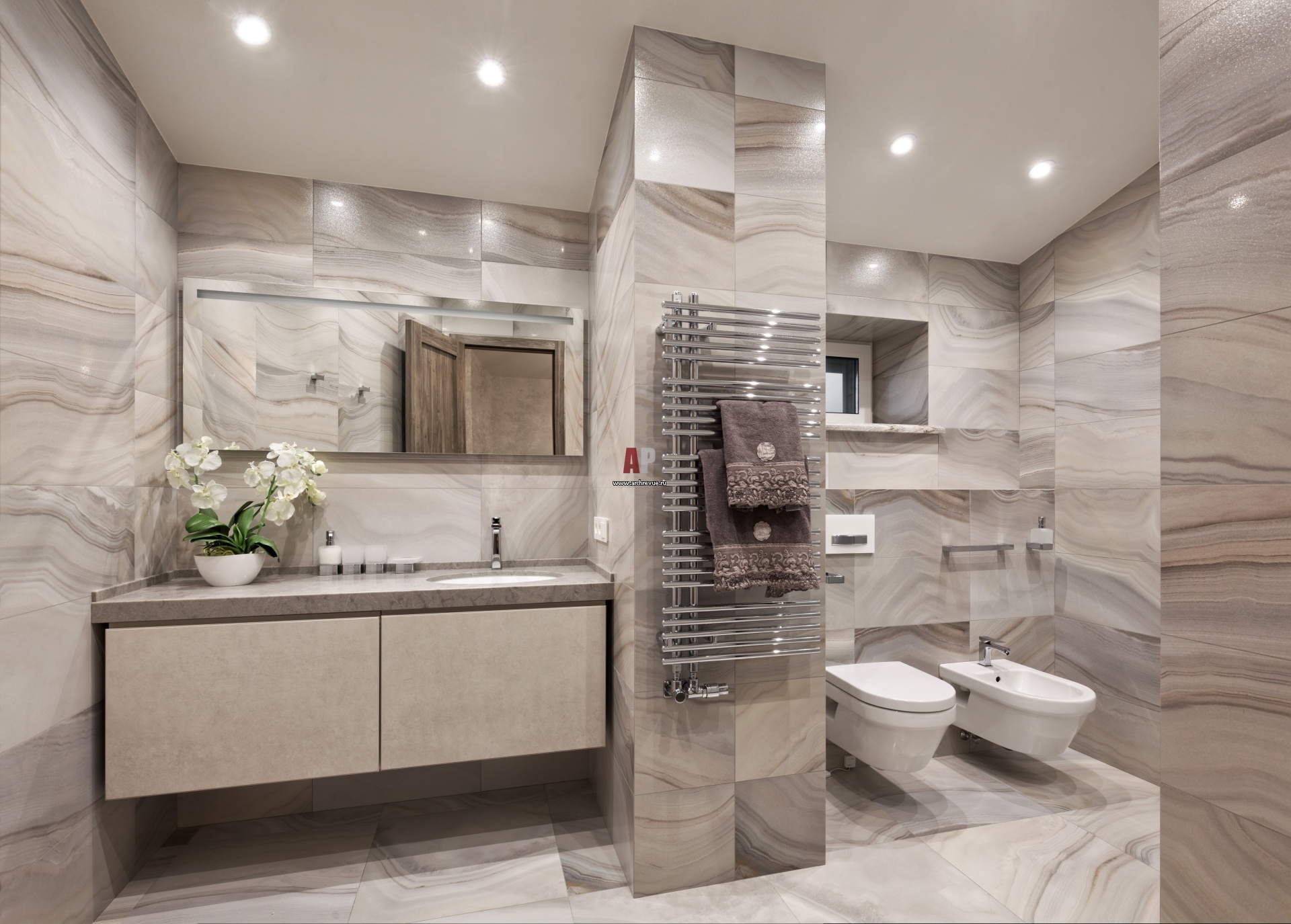 Санузел оформлен в современном стиле. Стены и потолок облицованы керамогранитом с фактурой мрамора. Плитка, Ceramiche Ricchetti, линия Roberto Cavalli.