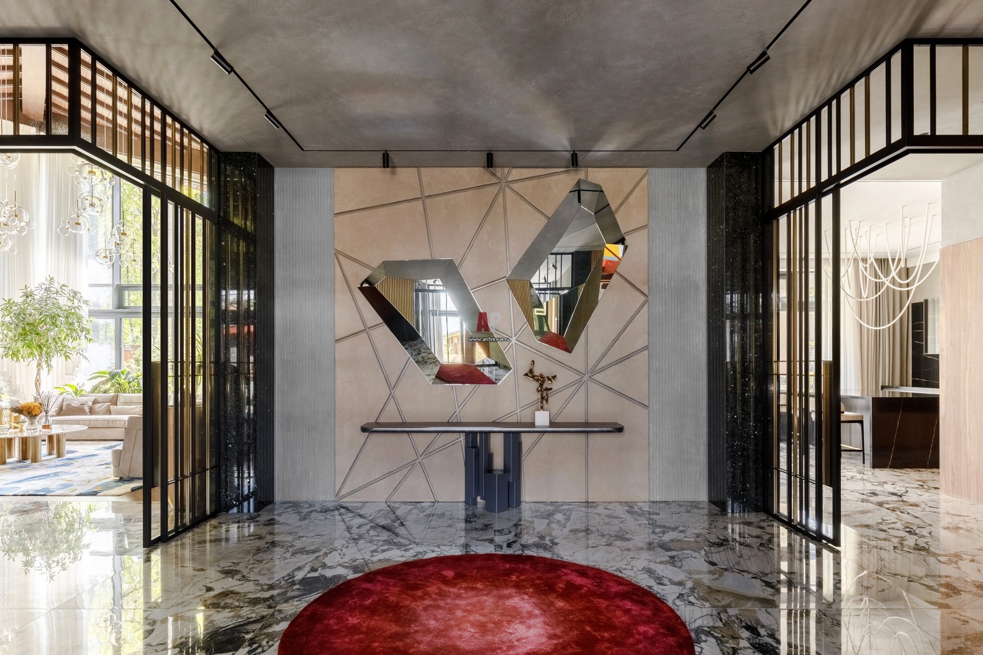 В холле открывается пространство всего дома. Раздвижные перегородки с выступающими углами позволяют просматривать по диагонали помещения гостиной и кухни. Консоль и зеркала, Cattelan Italia. Стена за ними зашита панелями из алькантары. На полу – керамогранит Rex с активным рисунком.