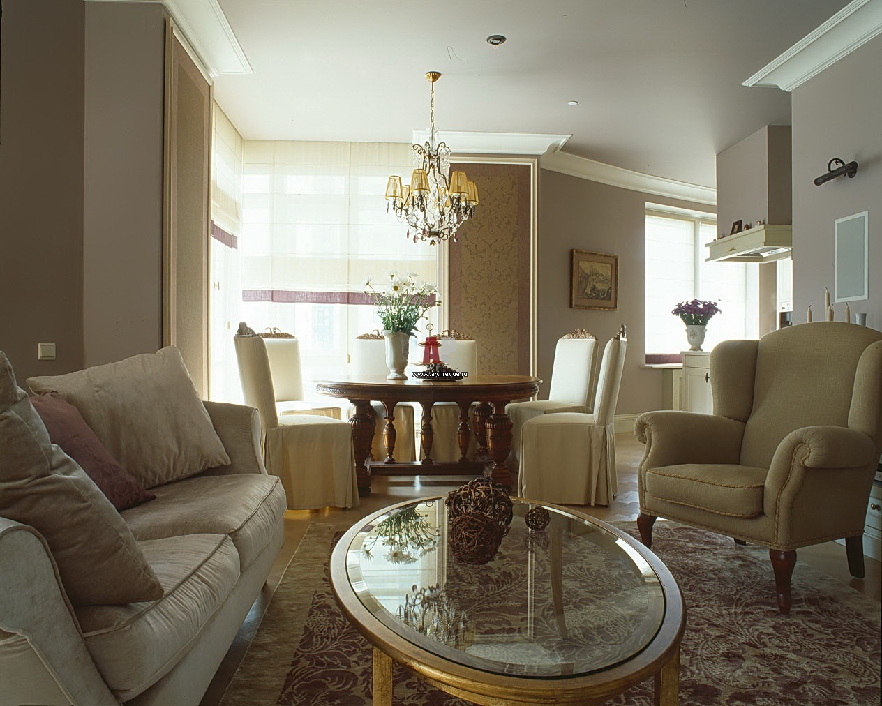Столовая группа размещена в эркере. Она акцентирована настенными панелями, обтянутыми тканью. Стол, антикварный.