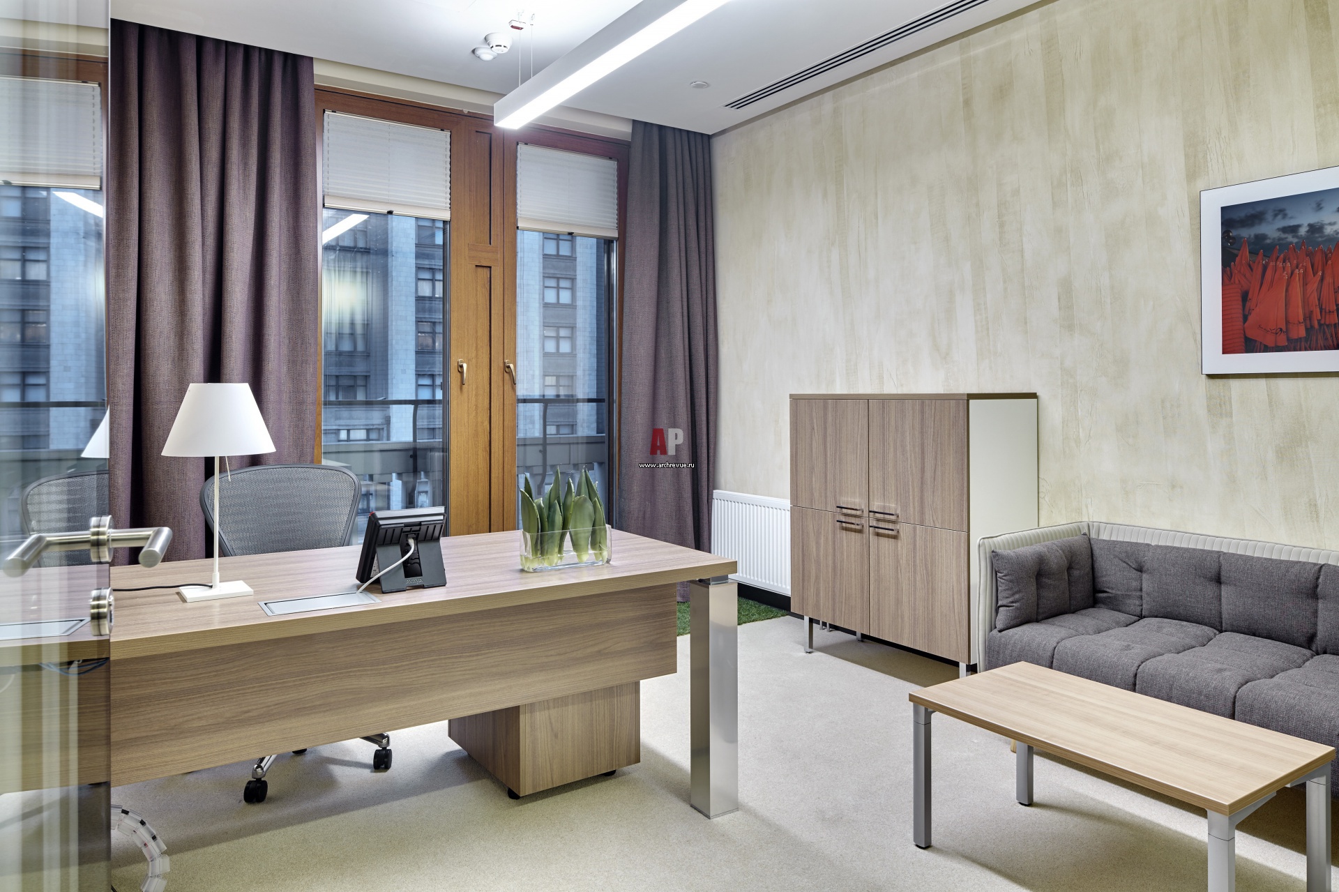 Фото интерьера изолированного рабочего кабинета в коворкинг-центре бизнес-класса. Деревянные окна, мебель с выраженной фактурой дерева, шторы теплого шоколадного цвета, декоративная штукатурка с тактильным эффектом создают обстановку уюта и защищенности.