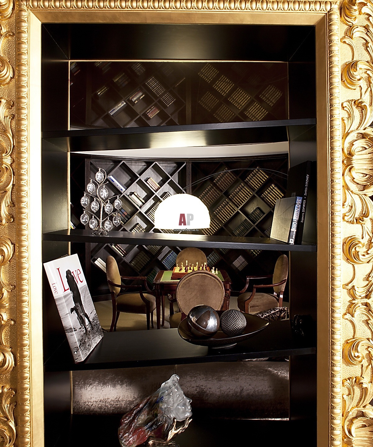 Фрагмент стеллажа Boffi в пышной золотой раме в библиотеке. За ним расположена зона библиотеки.