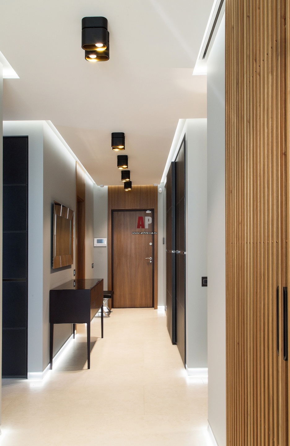 Интерьер прихожей квартиры выполнен в строгом мужском стиле. Входная дверь обрамлена высоким порталом из тика, изготовление «КингВуд».