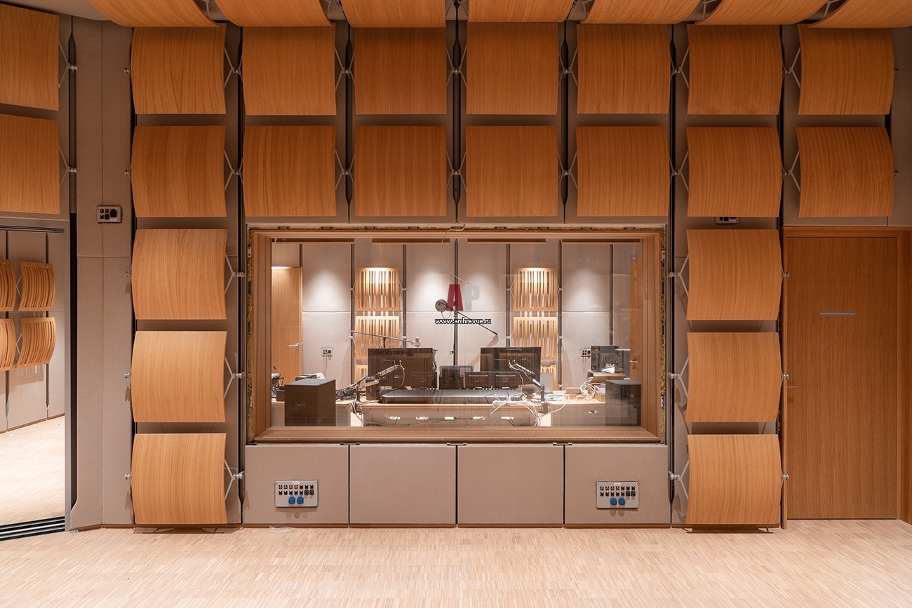 Единственной новой постройкой стал актовый зал, или, как его называют в мастерской, «Аудиториум», выступающий из исторического объема в сторону рощи. Зал-трансформер на 420 мест рассчитан на 10 комбинаций: сиденья складываются, сцена опускается и поднимается, акустические панели поворачиваются, окна закрываются шторами black out, а самое большое окно, выходящее в сторону рощи, превращается в экран, где можно устраивать кинопоказы, концерты, лекции и показы перформативного искусства.