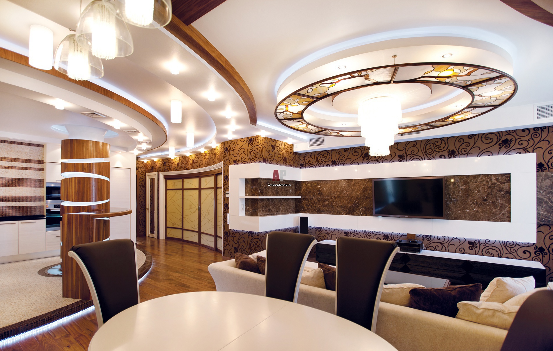 Вид со стороны столовой на мягкую зону с ТВ. Сложные потолки украшены карнизами из гнутого дерева.