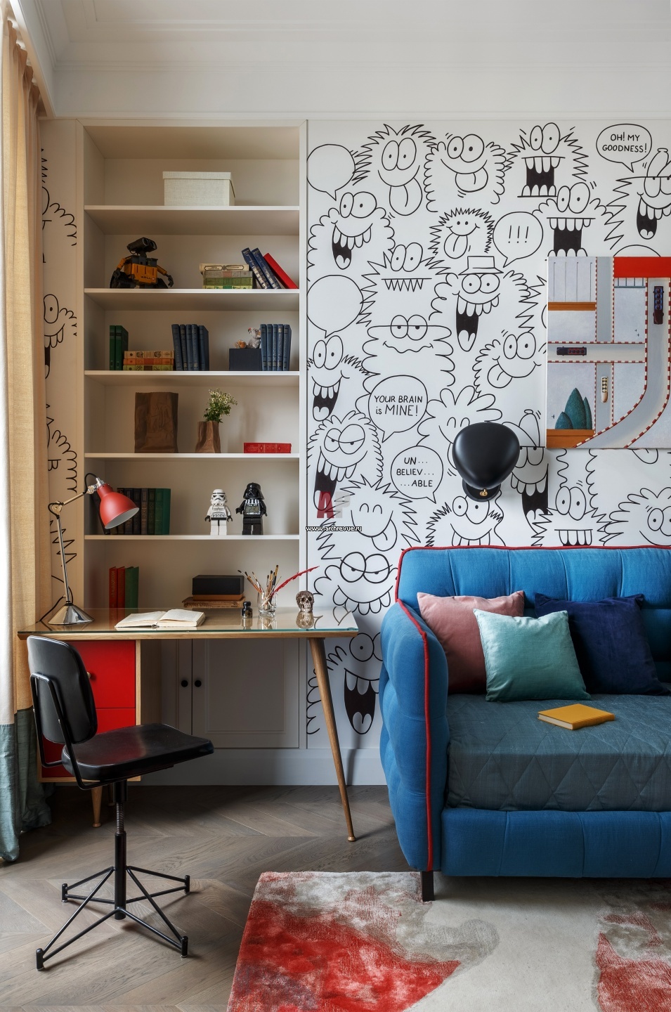 Спальня девочки. На стенах роспись по мотивам комиксов. Комод в стилистике 1960-х, Bragindesign. Люстра, De La Espada. Бра, Gubi. Ковер, Serge Lesage.