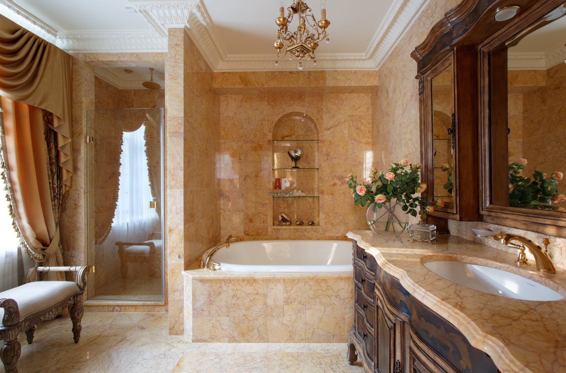 Главный санузел облицован мрамором сорта Crema Valencia красивого персикового оттенка и с богатой фактурой.