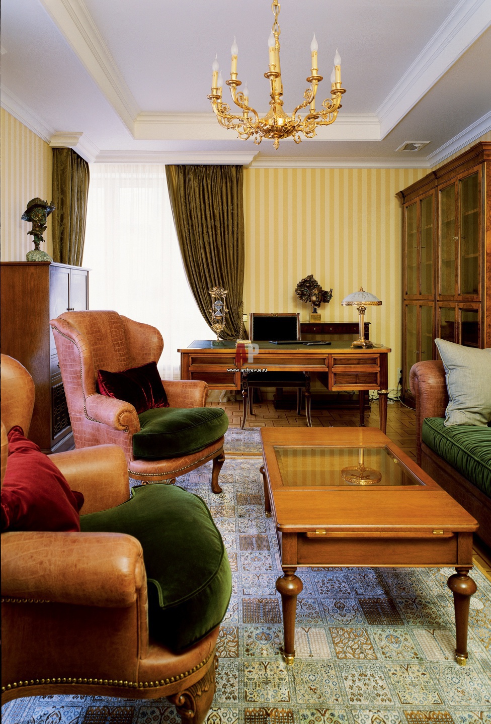 Кабинет в английском стиле. Лепные карнизы из гипса, поставщик «Петергоф». Текстильные обои, поставщик Skol.