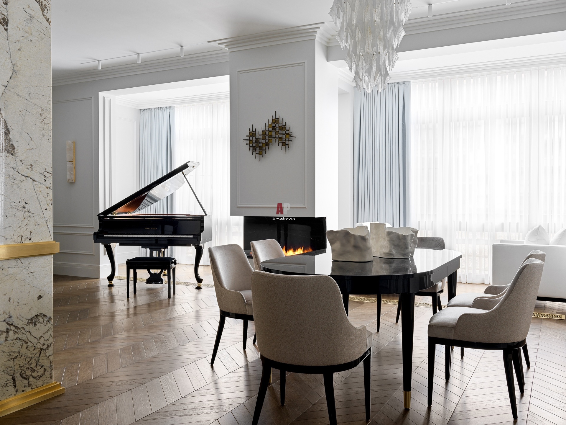 Каминная с музыкальной зоной. Паркет из натурального дуба, его оттенок дизайнеры подбирали очень тщательно. Важно, чтобы он не смотрелся фиолетовым, слишком темным, но и не устаревал со временем.