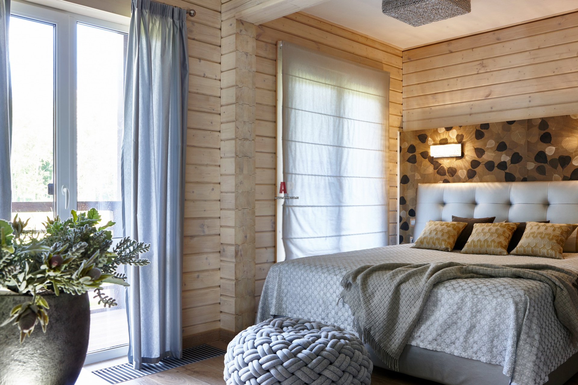 Гостевая спальня на первом этаже. Стена за кроватью частично оформлена натуральными обоями.