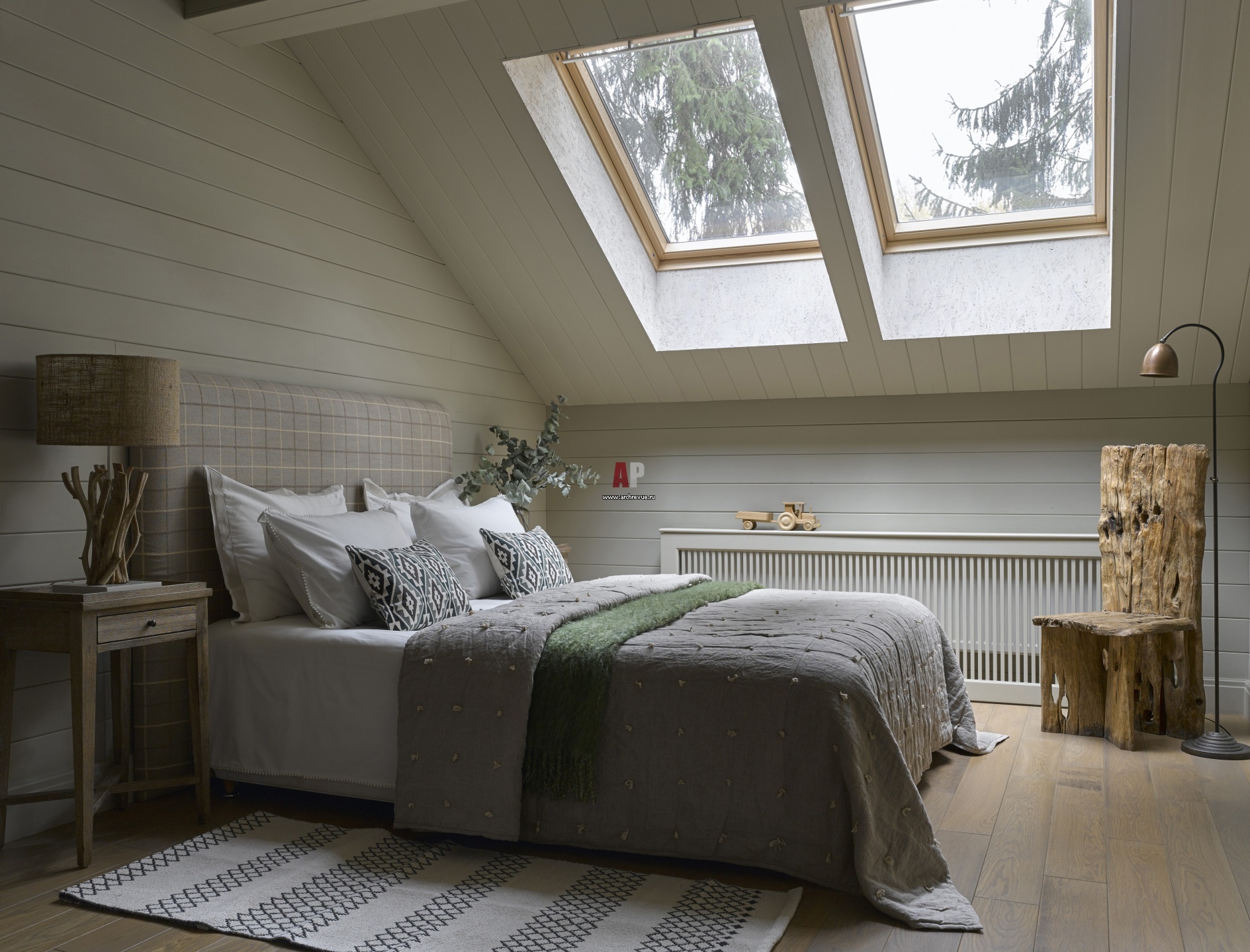 Интерьер спальни в мансарде. Кровать с изголовьем из серого текстиля выполнена по эскизам дизайнеров. Ткань в обивке кровати, Osborne&Little. Прикроватная тумба и светильник, WonderWood. Торшер, Eichholtz. Текстиль на кровати, Crate and Barrel.