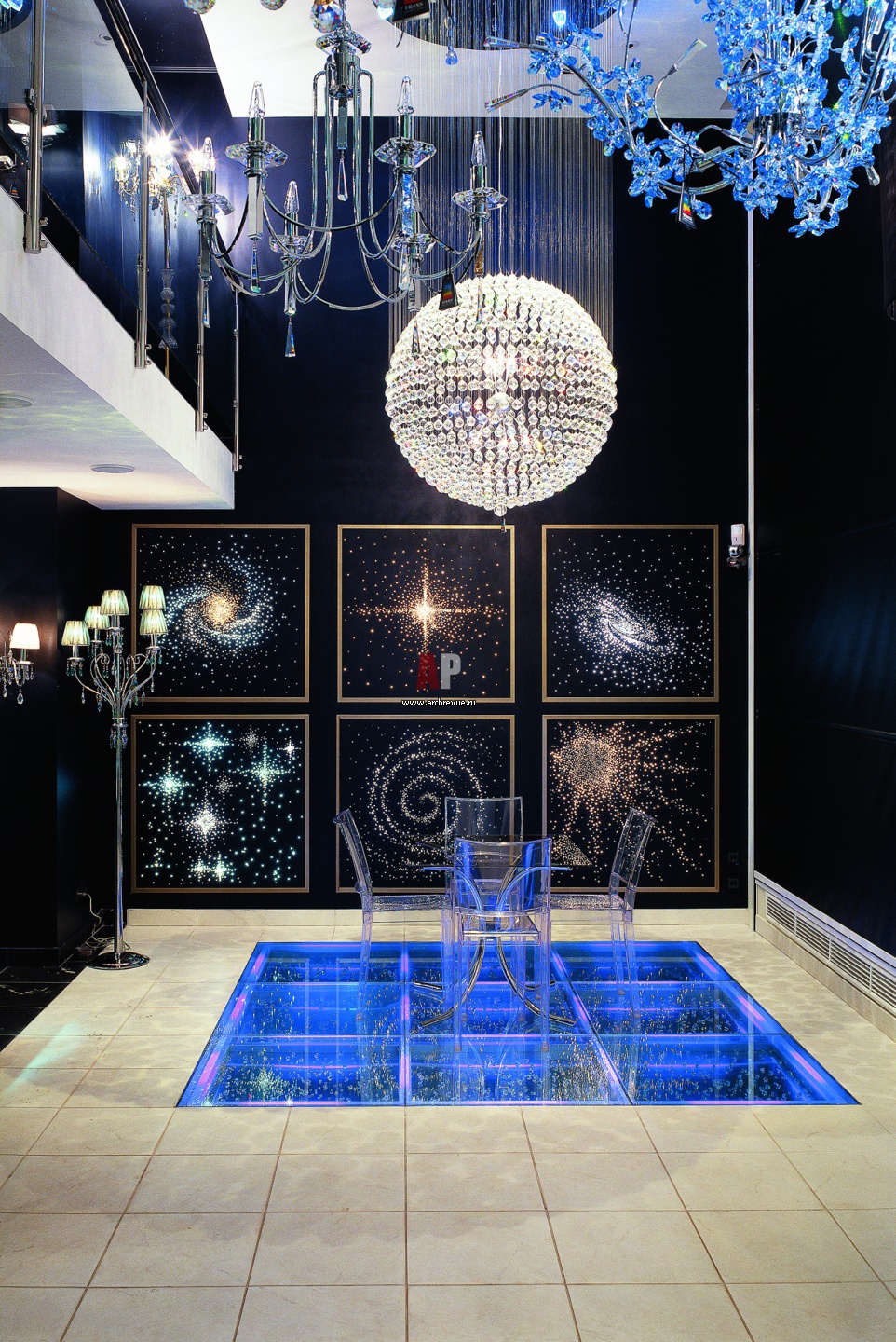 Зона первого этажа выделена подиумом, в центре которого вынута бетонная стяжка, и вместо нее уложен стеклянный настил, оснащенный подсветкой.