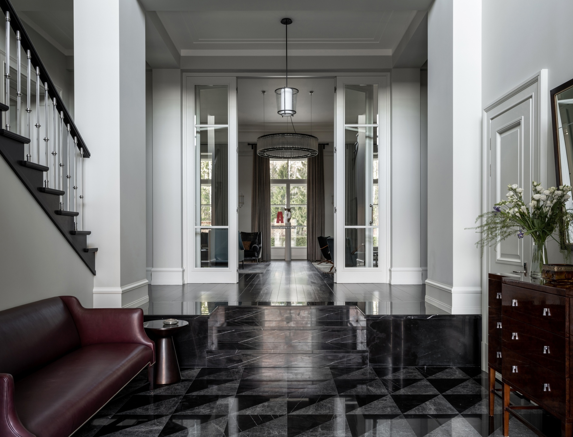 Парадная входная группа с лестничным холлом. Лестница – тонированный дуб, балясины – полнотелые трубки из акрила с декоративными элементами из стали.