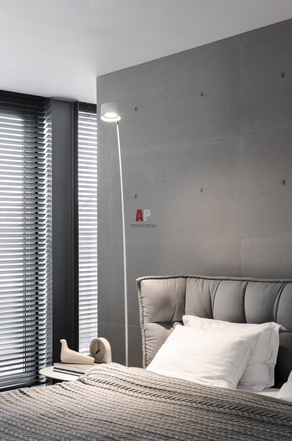 Гостевая спальня. Стены выполнены из бетона. Кровать, прикроватный столик, B&B Italia. Торшер, Davide Groppi.