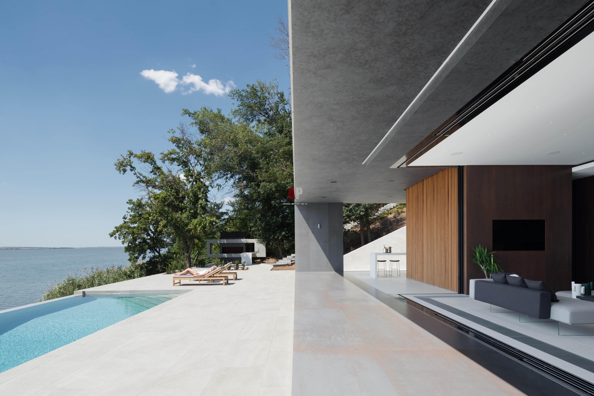 Крытая веранда с панорамным остеклением «вливается» в патио с бассейном. Стеклянные витражи полностью уезжают в стену, объединяя ее с улицей. «Почему мы не сделали ее открытой, ведь это Юг России? Потому что в начале лета в этой местности несколько недель настоящее нашествие зеленых комаров, их выносят с веранд ведрами. Чтобы уберечь мебель и обстановку, мы установили стеклянную стену», - рассказывает Александра Федорова.
