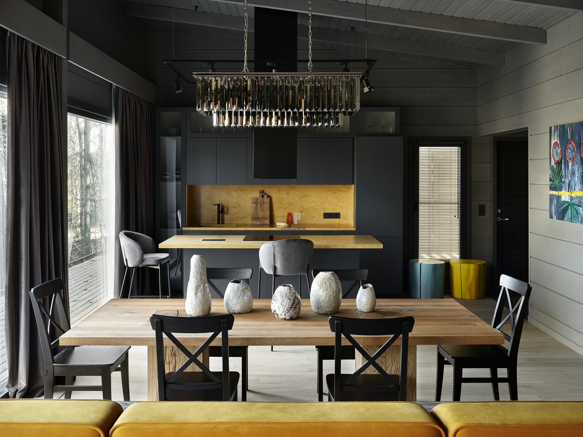 Изначально планировалось создать интерьер в черно-белой монохромной гамме, но при выборе обивок для мебели заказчику понравился фиолетовый велюр. Однако дивана желаемого цвета не оказалось в наличии, и тогда он неожиданно выбрал желтый. К дивану подтянулась столешница из камня желтого цвета и фартук на кухне (которые по проекту также должны были быть монохромными).