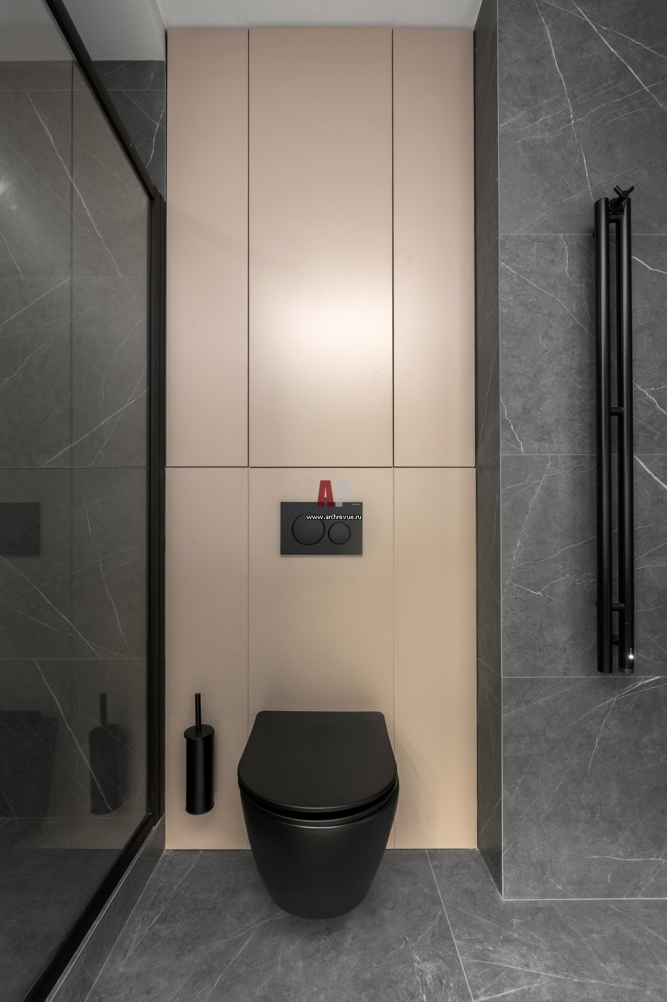 Детский санузел. Подвесной унитаз, Grossman. Полотецесушитель, «Cунержа», модель «Нюанс». «Впервые за свою практику мы использовали плитку темных оттенков в детском санузле. Атмосферу в интерьере мы разнообразили за счет различных сценариев освещения, оттенков мебели сантехники, а также формы мебели», - рассказывает дизайнер Дарья Максимова.