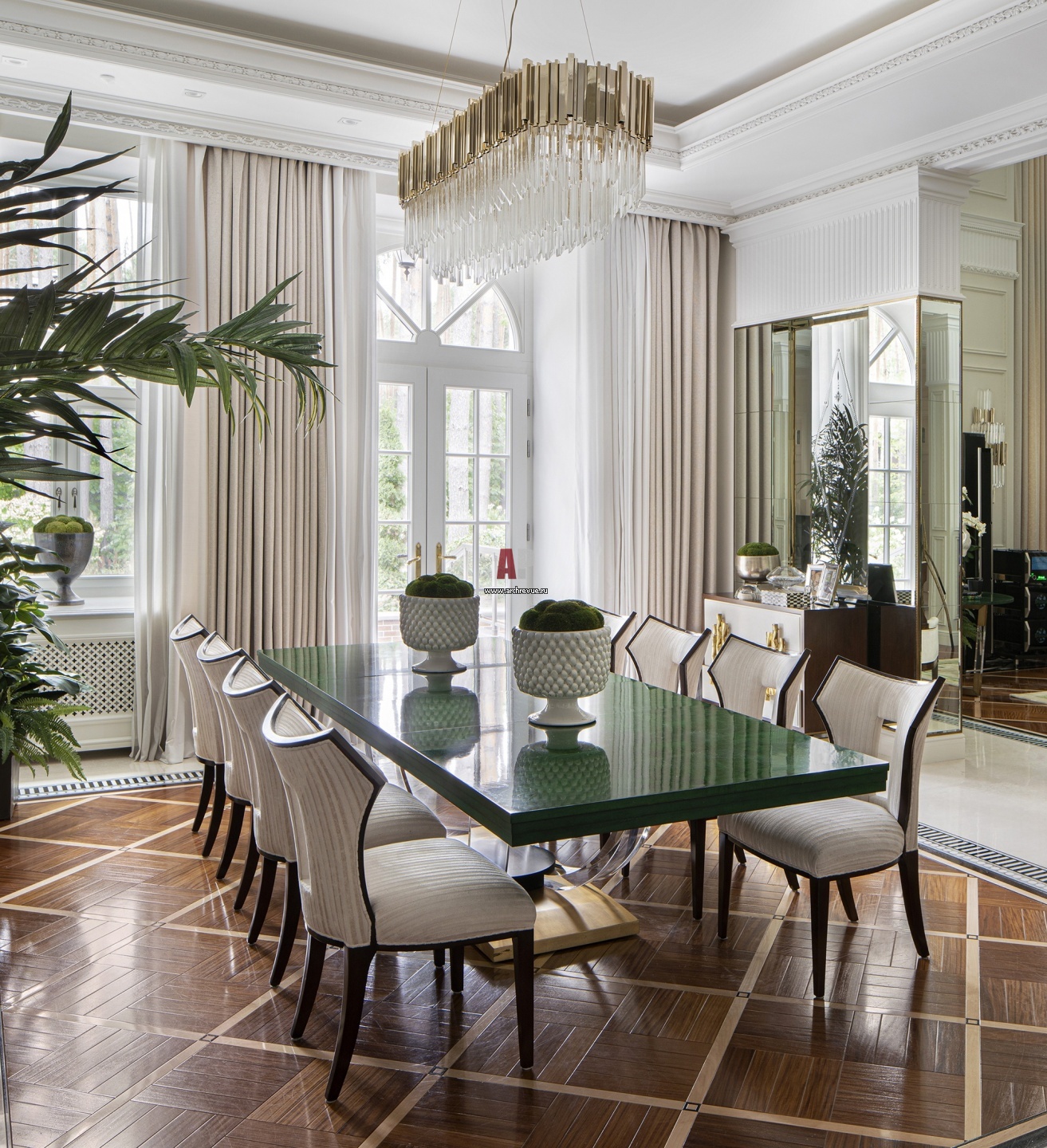 Столовая. Обеденный стол с эффектной зеленой столешницей и стеклянной опорой на золотом основании, Century Furniture. Стулья, Councill и E.J. Victor. Люстра над столом, Luxxu.
