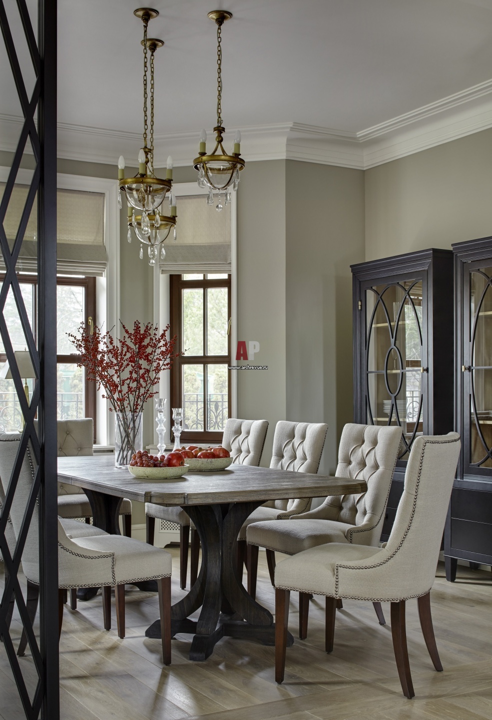 Интерьер столовой в стиле современная классика с элементами традиционного американского дизайна. Декоративные перегородки и буфеты выполнены по эскизам дизайнера.