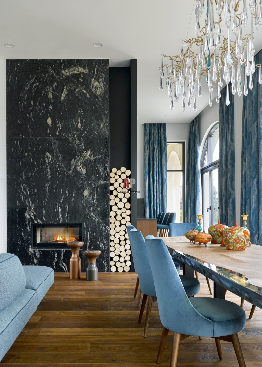 Гостиную-столовую от кухни отделяет двусторонний камин. От пола до потолка он облицован черным гранитом с активным рисунком, с двух сторон сделаны вертикальные ниши-дровницы.