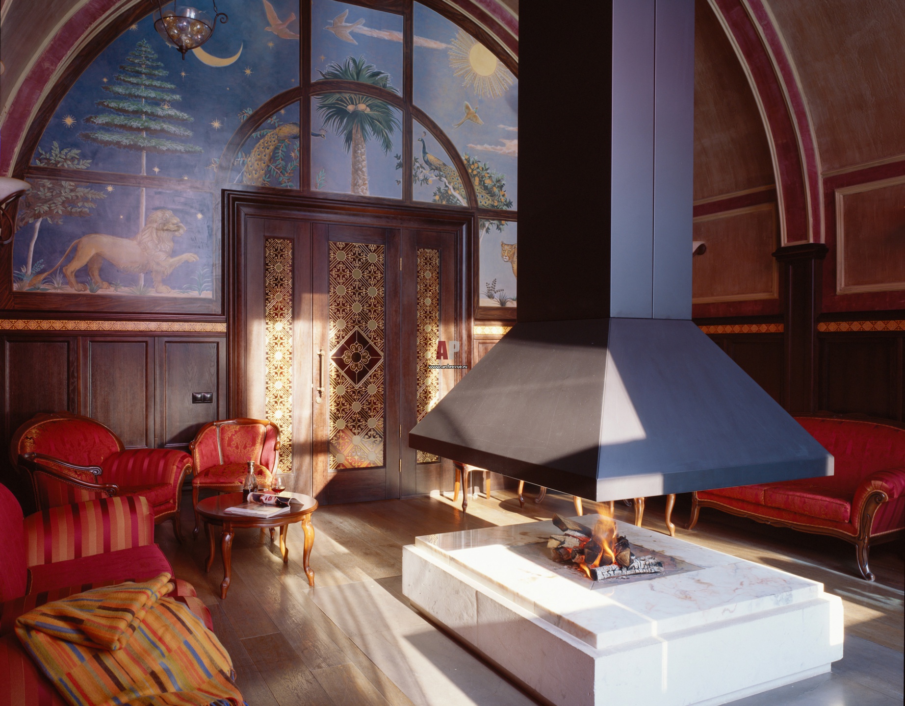 В центре каминного зала – каменная платформа с открытым очагом. Над ним – мощная каминная труба из крашеного металла. На полукруглой стене роспись со сказочным сюжетом.