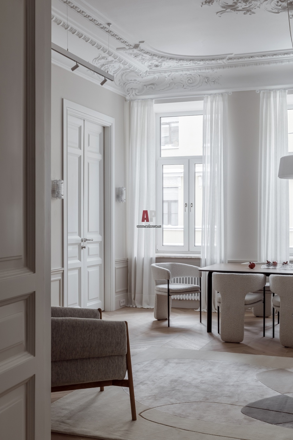 Гостиная-столовая. Столетние двери и аутентичная гипсовая лепнина были тщательно отреставрированы и сохранены.
