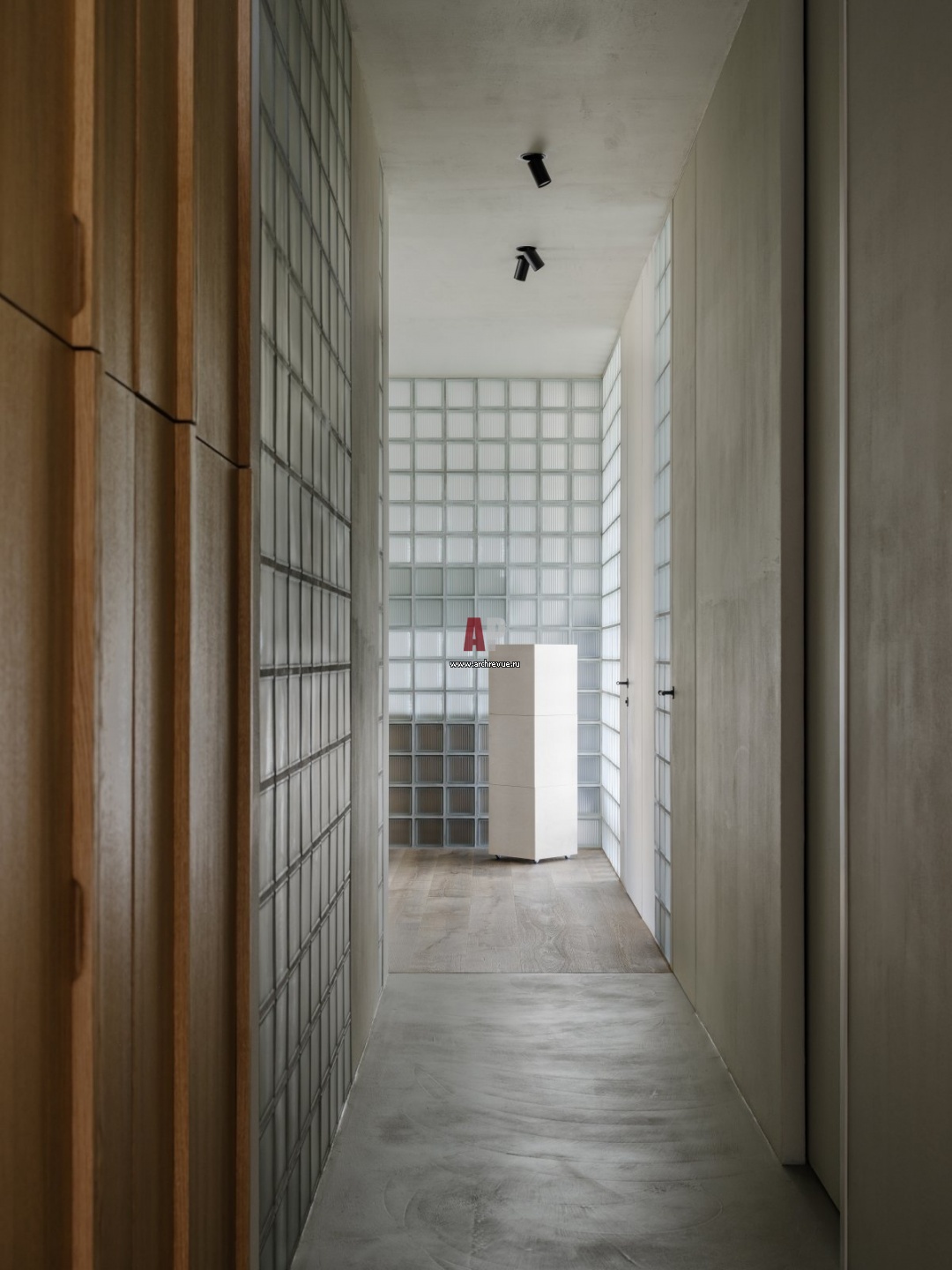 Длинный коридор соединяет общественное крыло с приватным. Контраст масштаба и освещенности, а также перегородки из стеклоблоков, которые разбивают монотонность коридора.