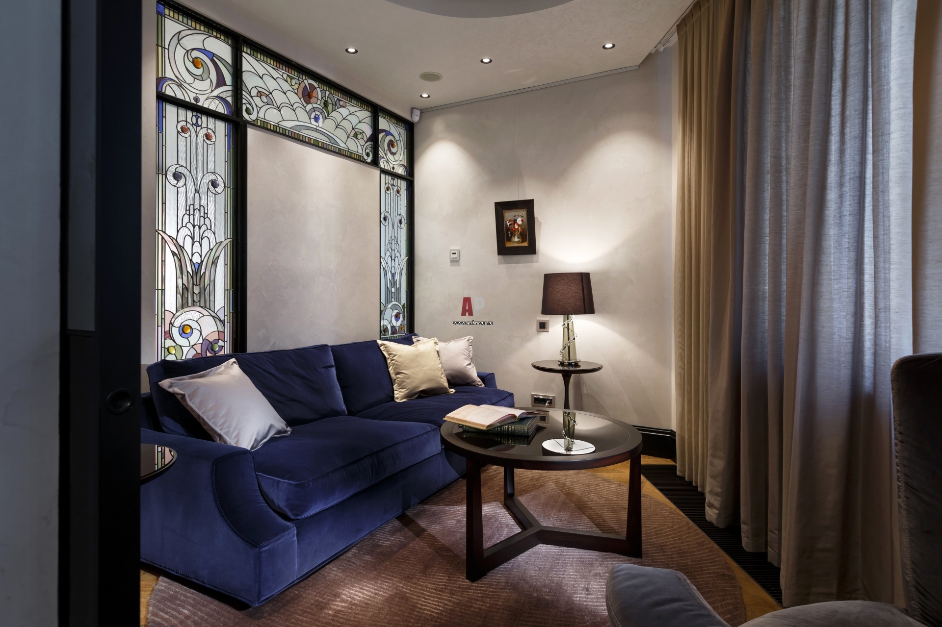 Комната отдыха или приватная гостиная примыкает к ванной комнате с двусторонним витражом. Вход в нее организован из гостиной. Светильник, Barovier & Toso. Диван, Giorgetti.
