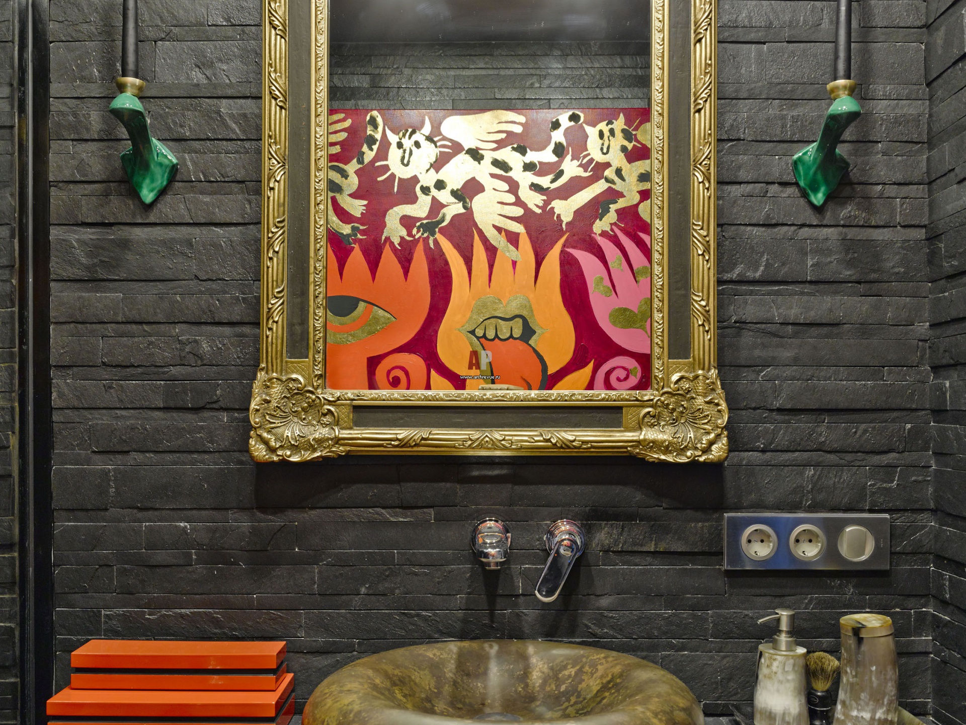 Стены небольшого санузла облицованы темно-серым сланцем. Камень пилили рабочие на месте. В зеркале отражается ироничная картина художника-постмодерниста.