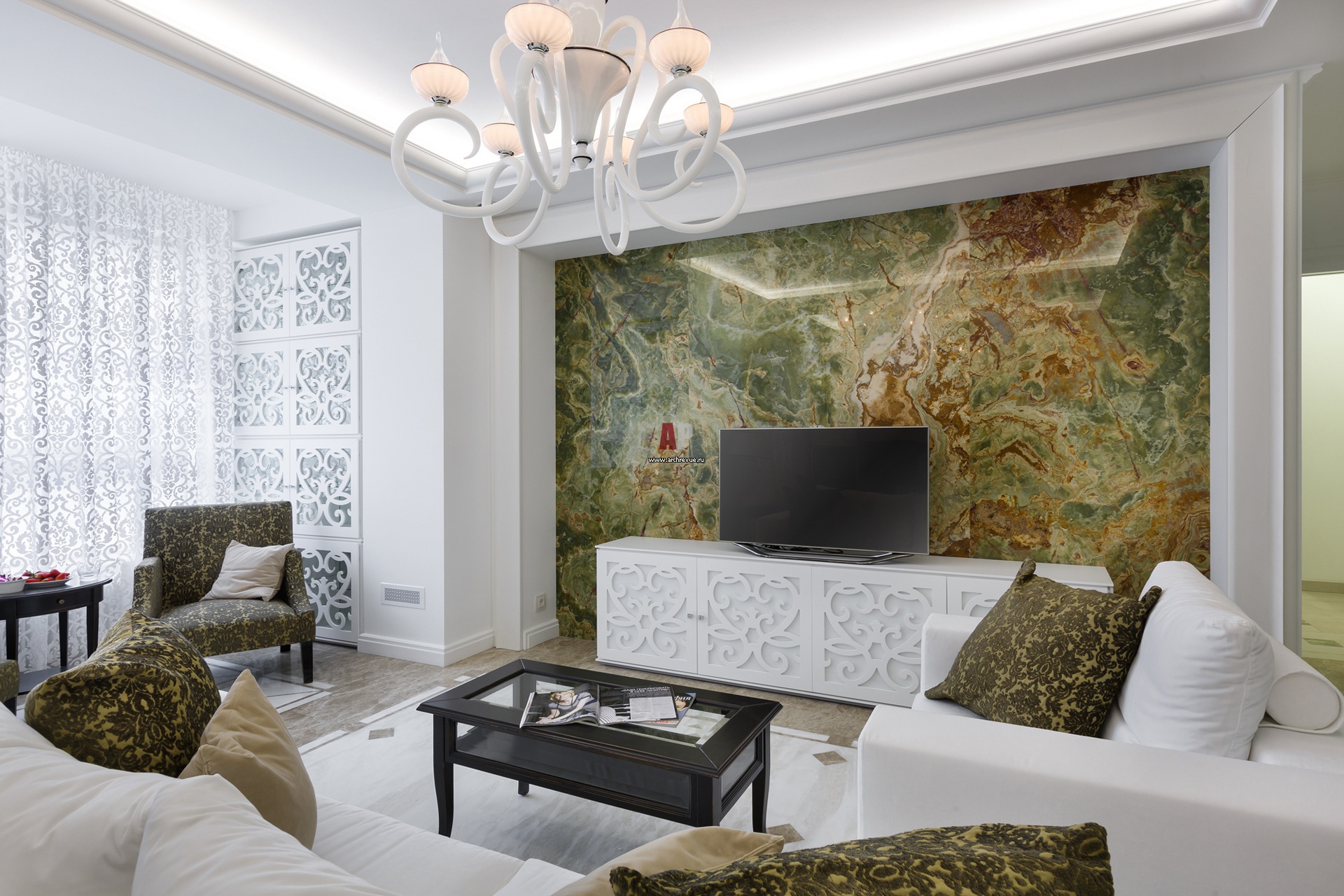 Фото гостиной с зоной ТВ. Главное украшение белоснежной квартиры – панно из полированного оникса насыщенного зеленого цвета. Оно собрано из четырех слэбов и обрамлено широким ступенчатым порталом. При выборе фрагментов слэбов для панно авторы стремились составить выразительный, но не пёстрый рисунок, который интересно смотрелся бы на любом расстоянии.