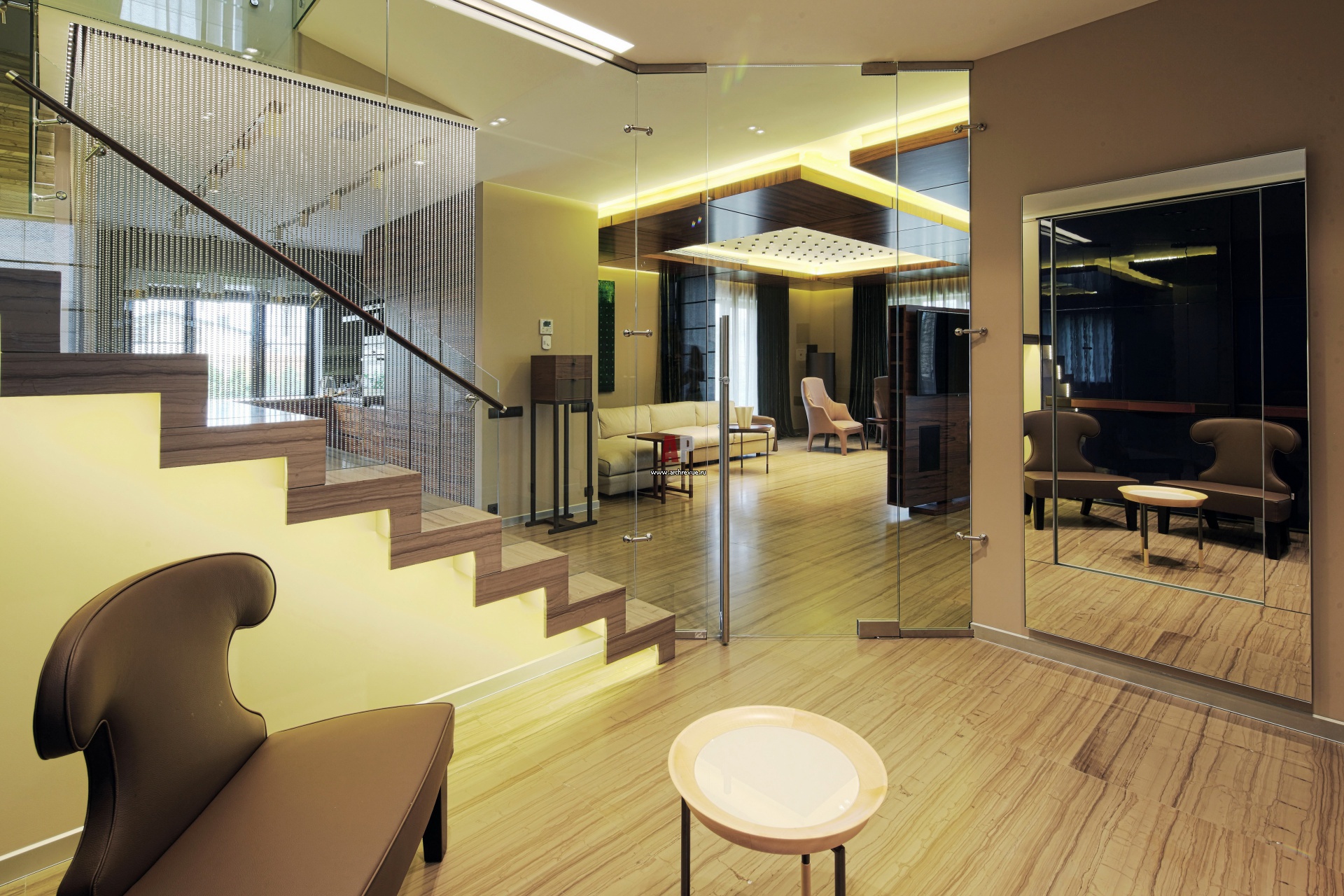 Входную зону от общей гостиной отделяет стеклянная стена. Пол выстлан бежевым мрамором сорта Serpeggiante Grigio. Кожаные кресла, Giorgetti.